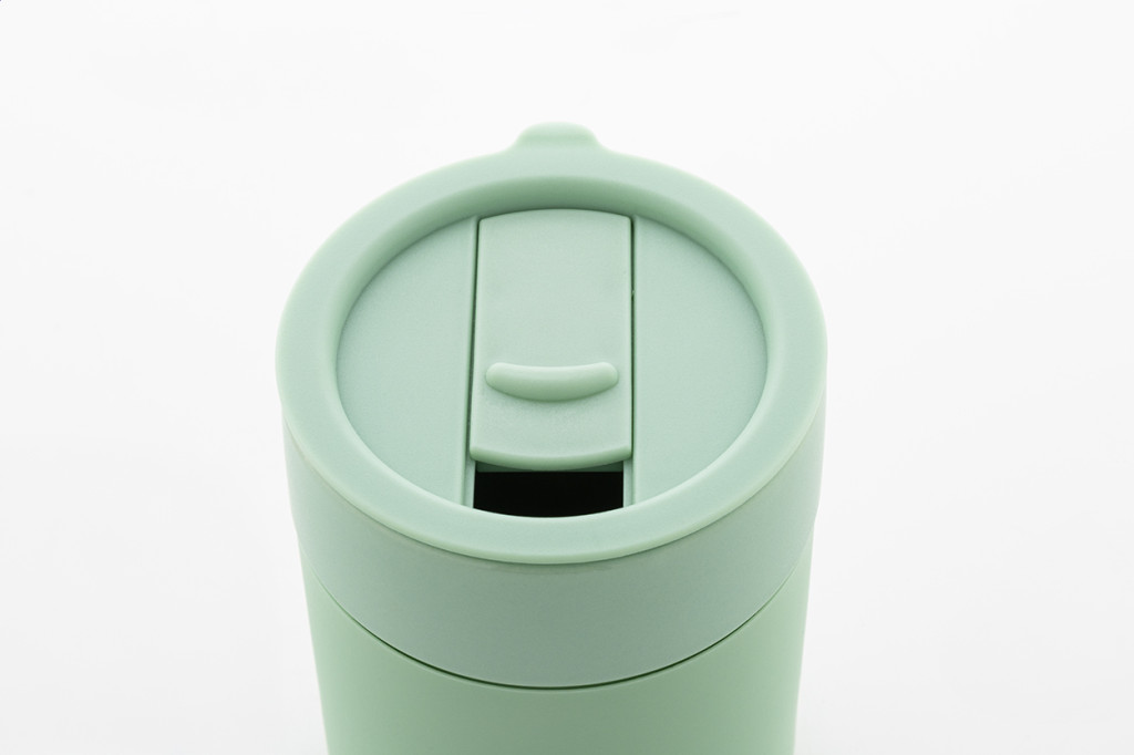Szilikon borítású kerámia utazópohár PP műanyag ivófedéllel, 300 ml.