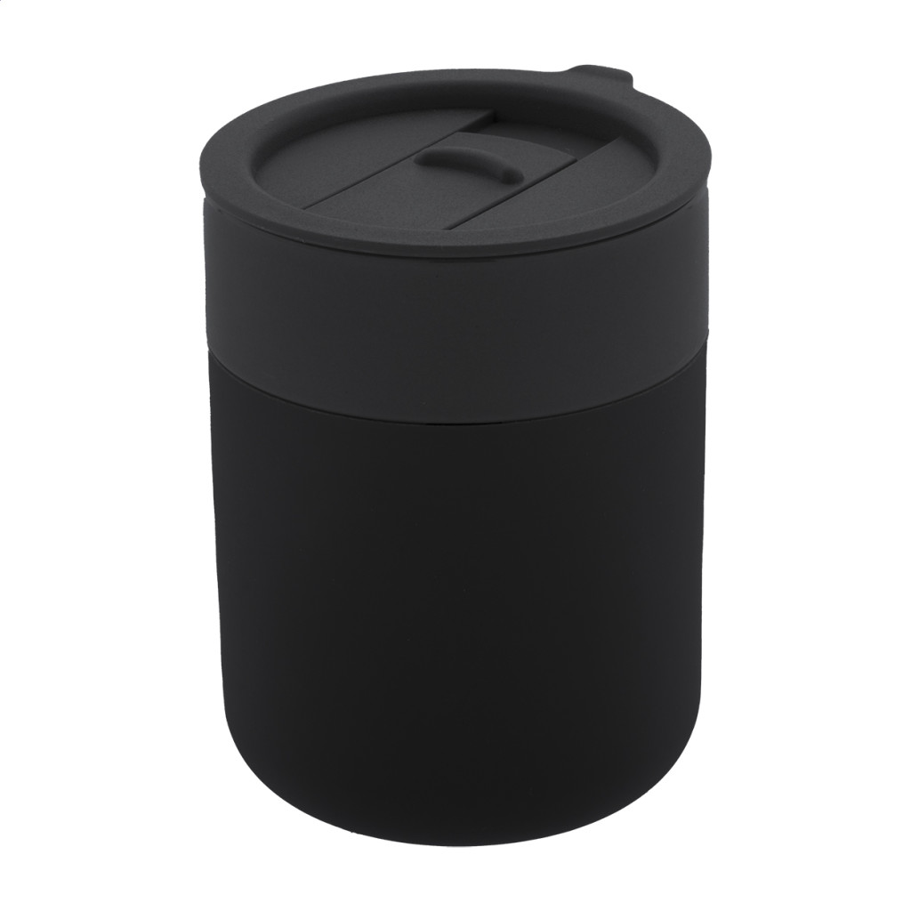 Szilikon borítású kerámia utazópohár PP műanyag ivófedéllel, 300 ml.
