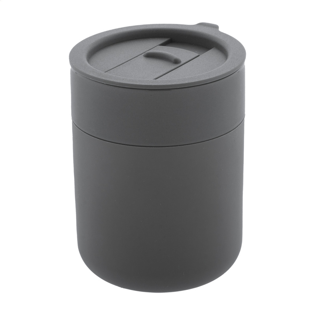 Szilikon borítású kerámia utazópohár PP műanyag ivófedéllel, 300 ml.