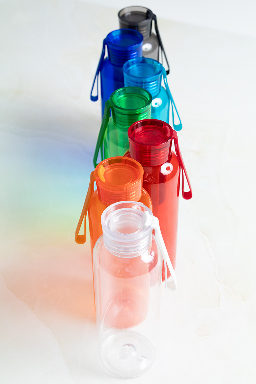 RPET kulacs színvben hozzáillő tetővel és szilikon hordszíjjal, 500 ml. Nem alkalmas szénsavas italok tárolására.