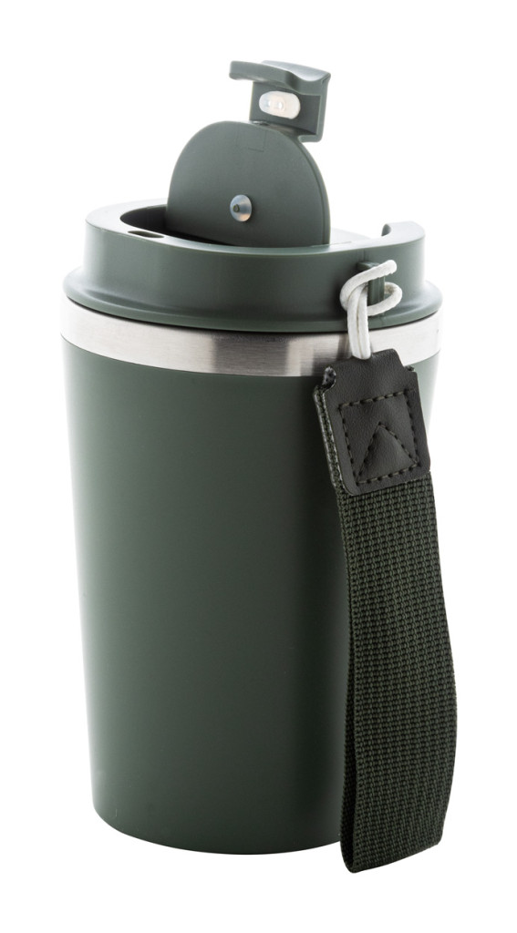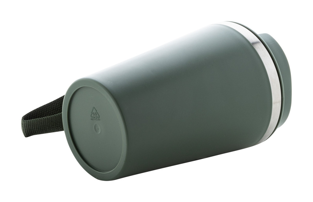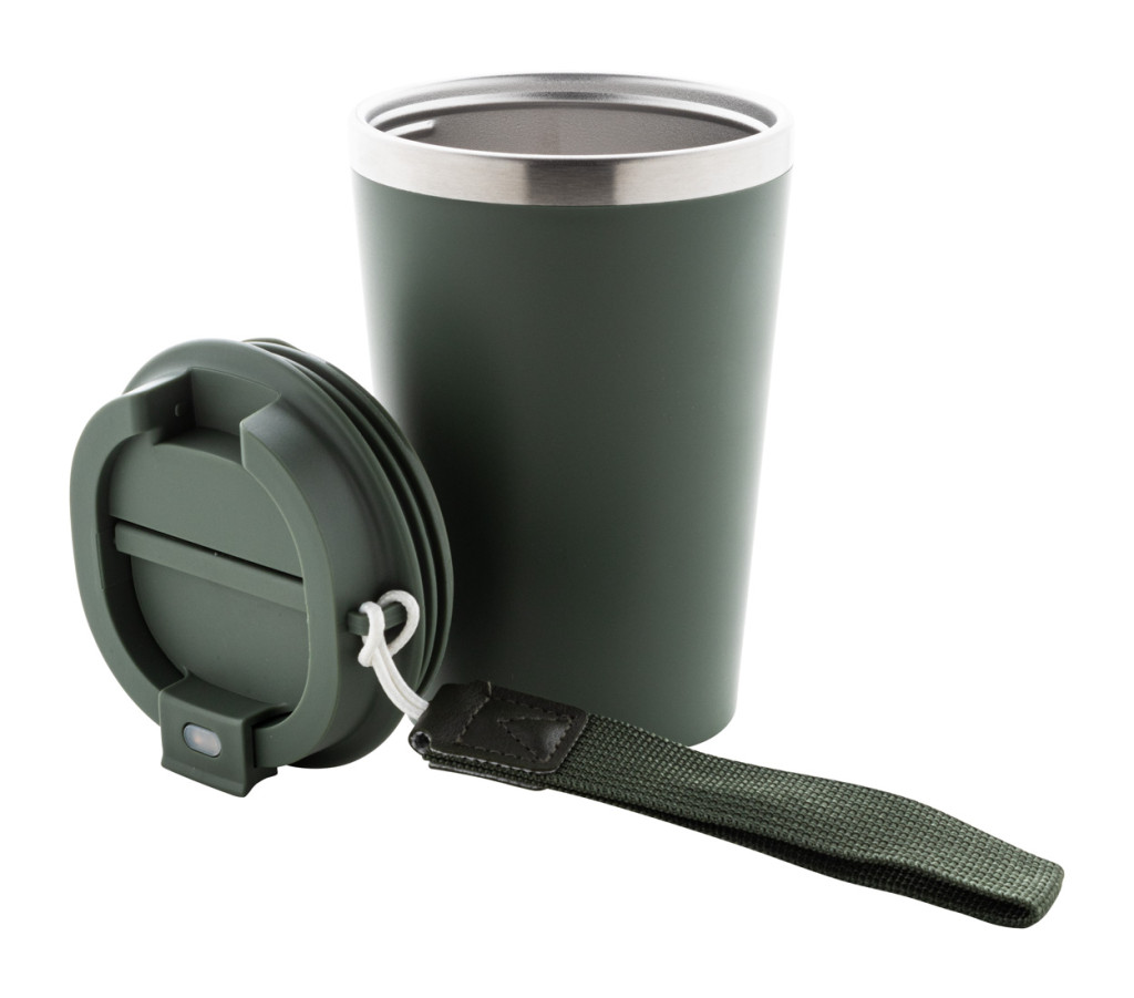 Duplafalú, újrahasznosított rozsdamentes acélból készült hőszigetelt thermo pohár, PP műanyag külsővel és ivófedéllel. RPET hordpánttal. 350 ml.