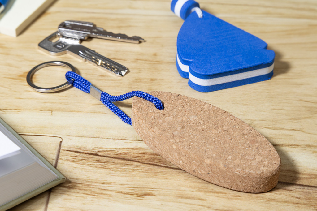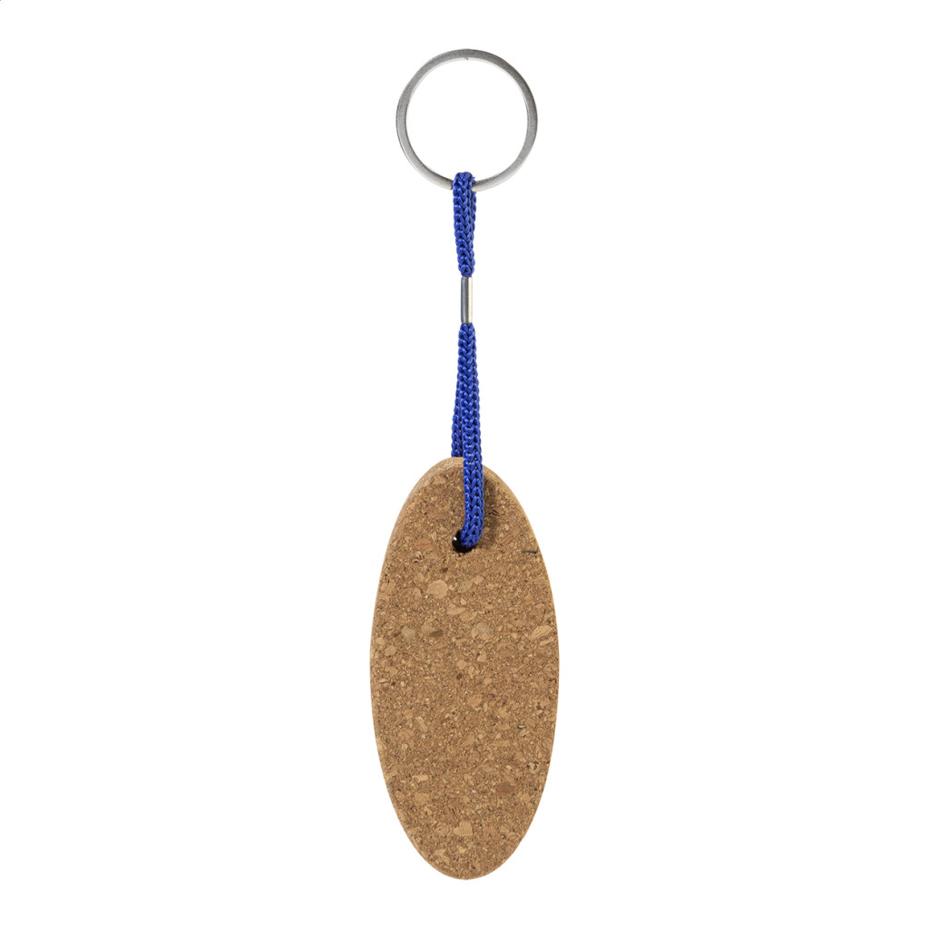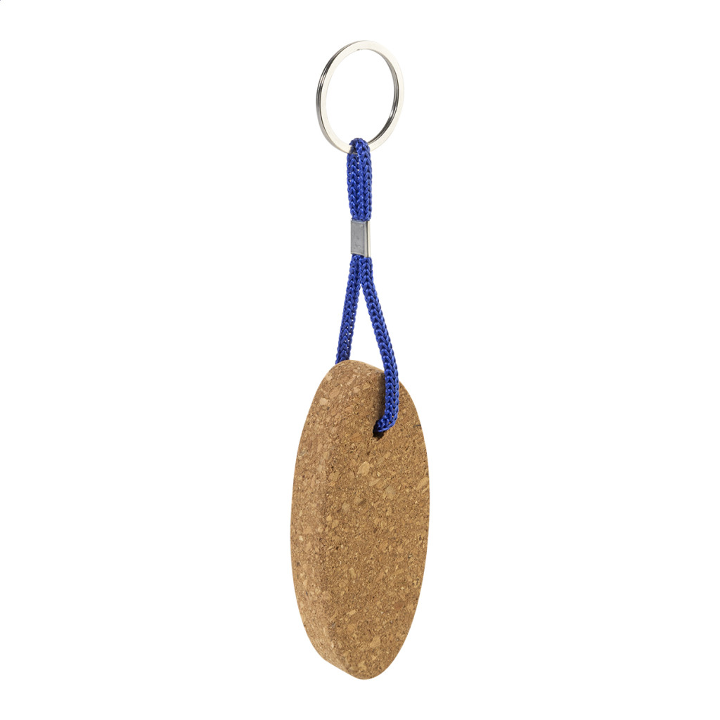 Természetes parafából készült lebegő kulcstartó poliészter zsinórral és fém karikával.