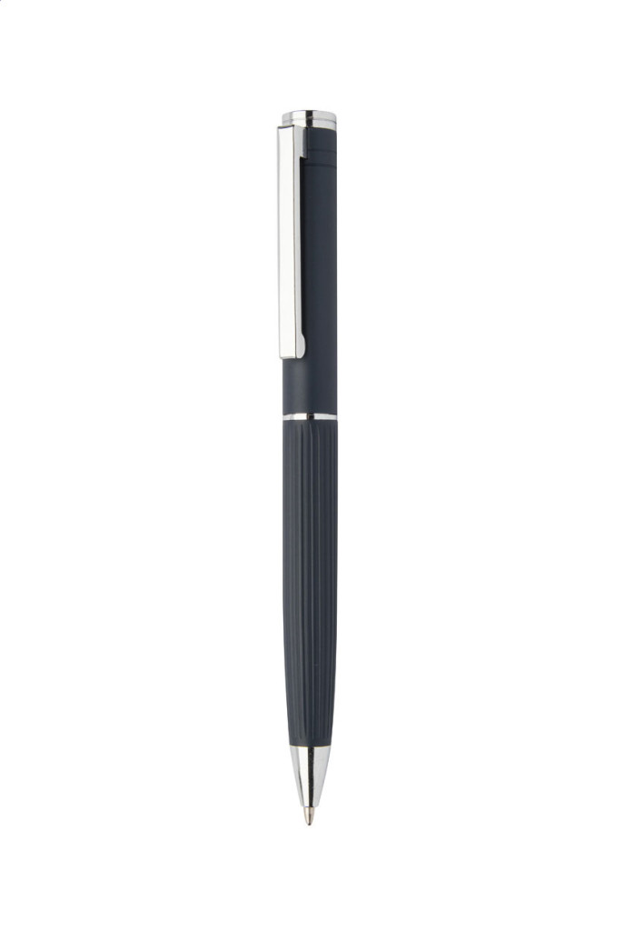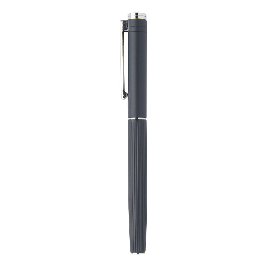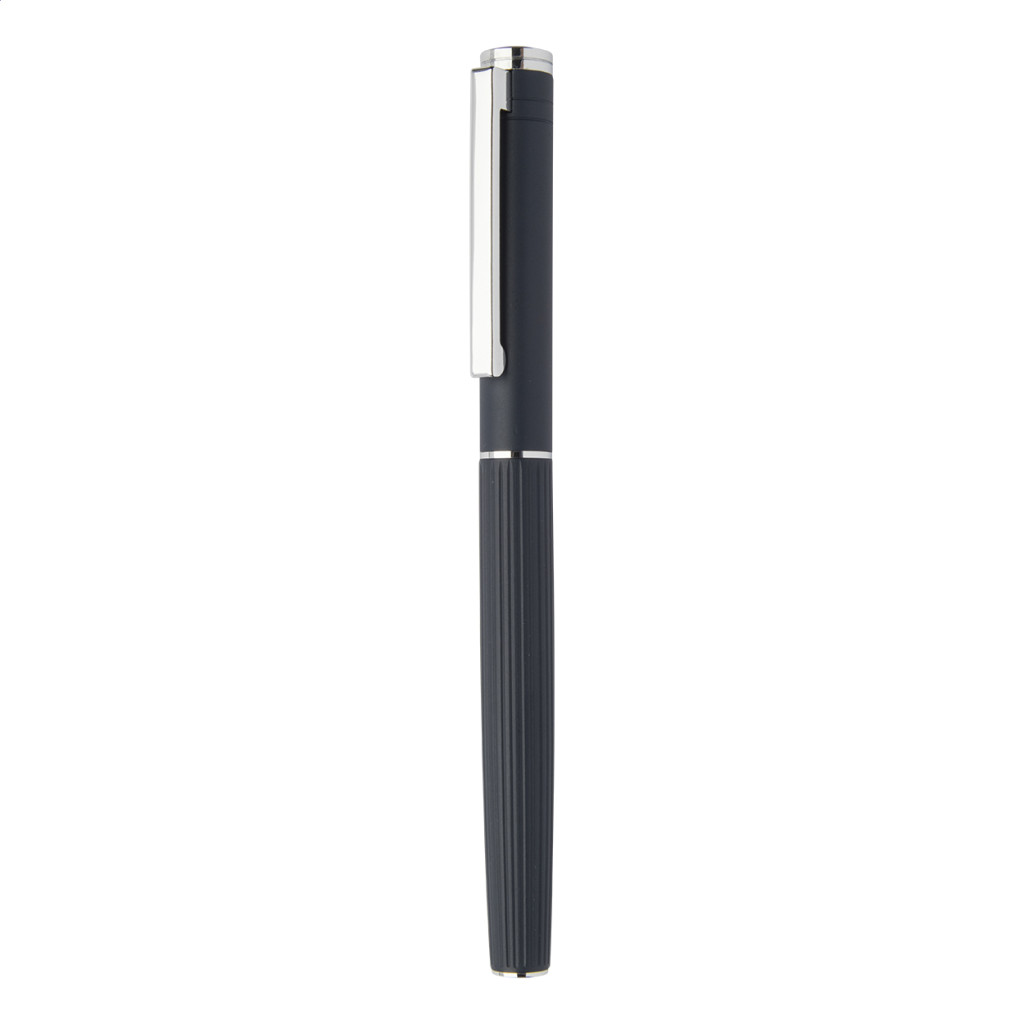 Elegáns, alumínium golyóstoll és rollertoll szett, csíkozott felülettel. Fekete díszdobozban, kék tollbetéttel szállítjuk.