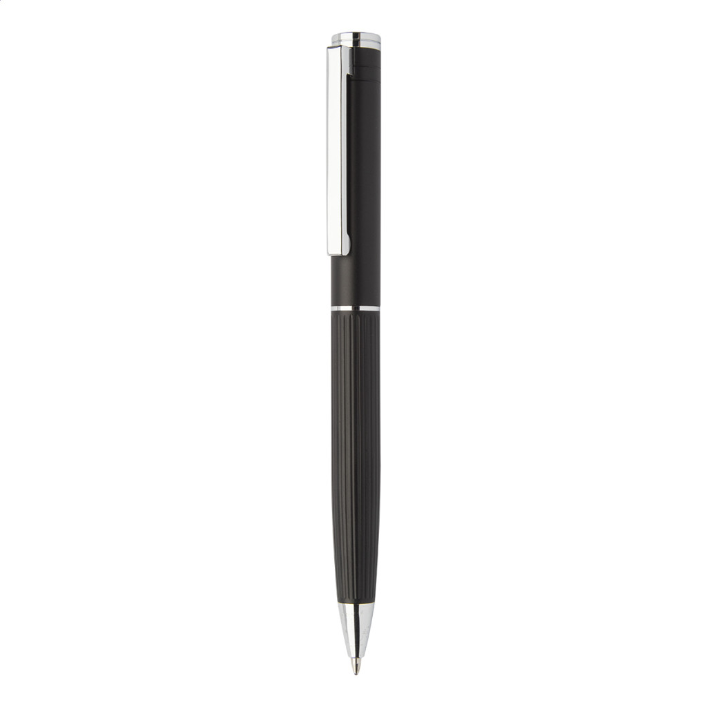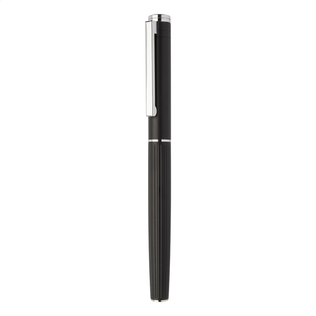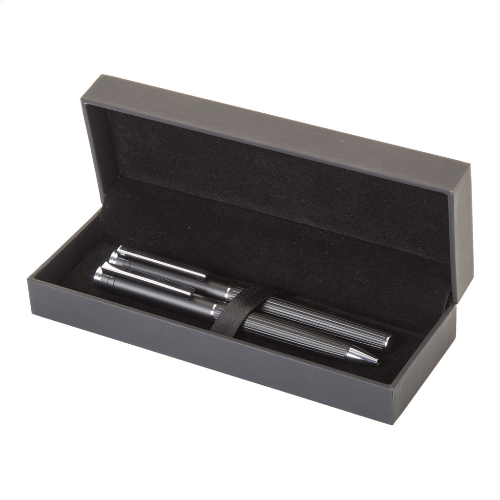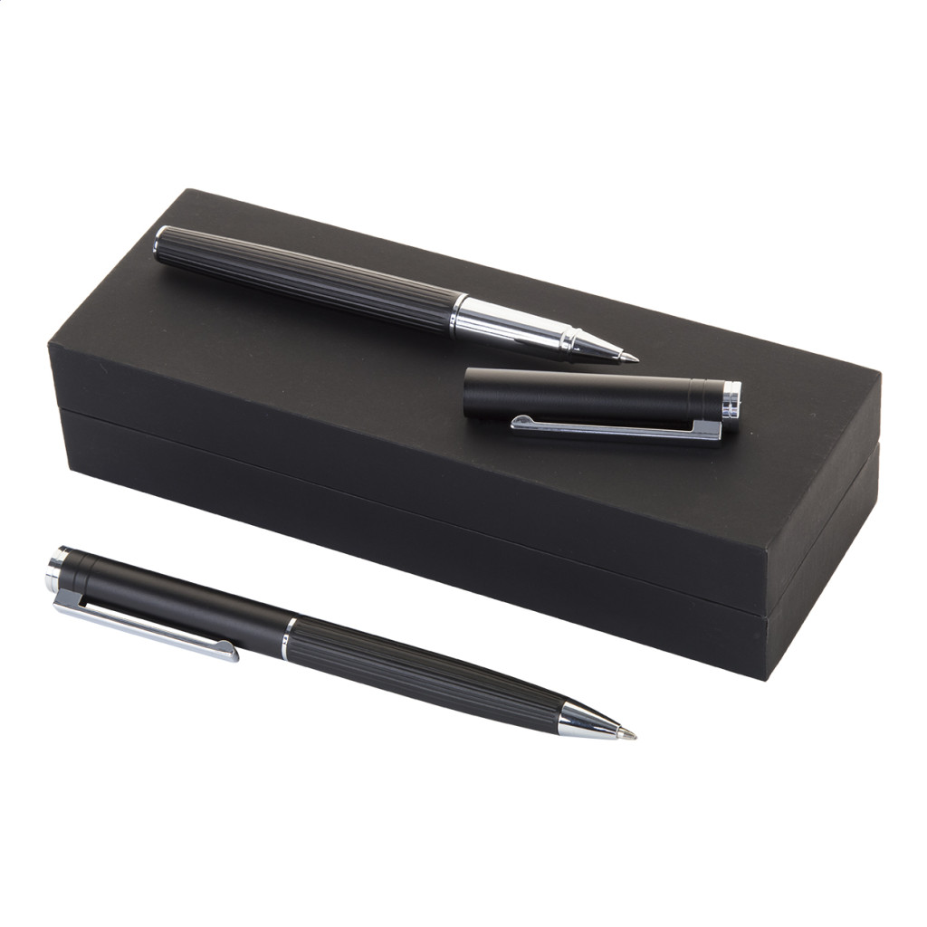Elegáns, alumínium golyóstoll és rollertoll szett, csíkozott felülettel. Fekete díszdobozban, kék tollbetéttel szállítjuk.