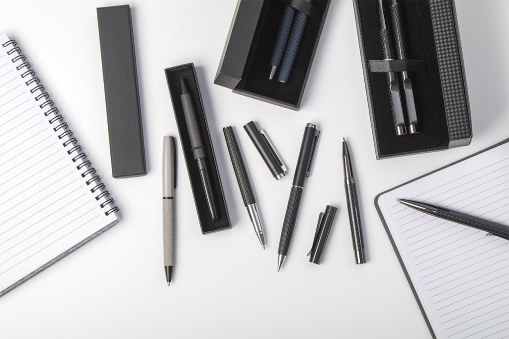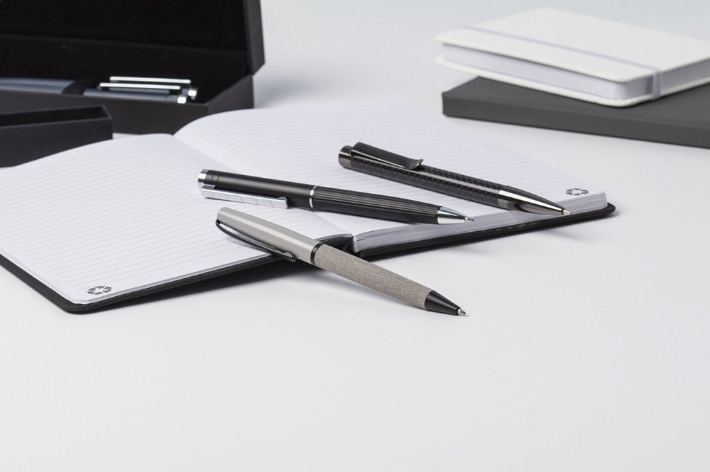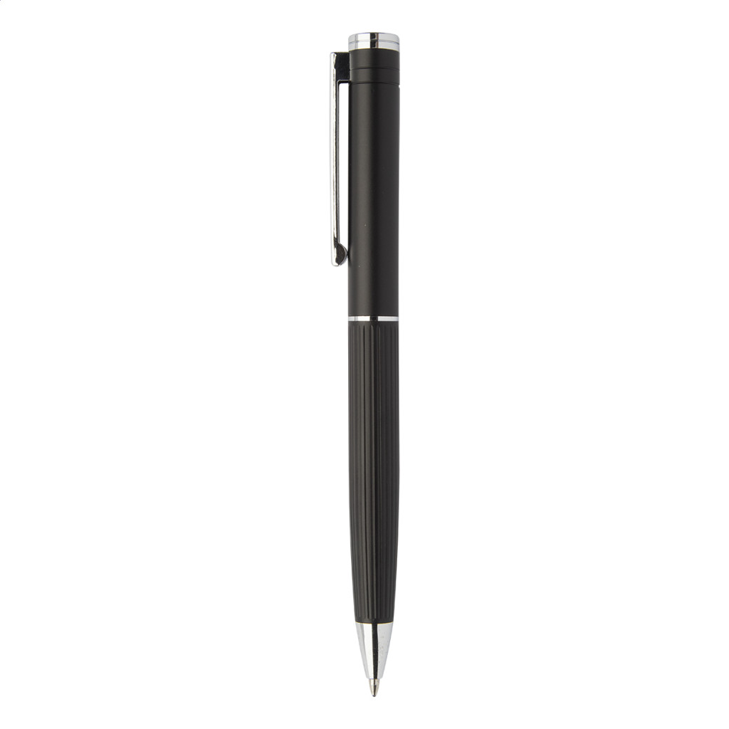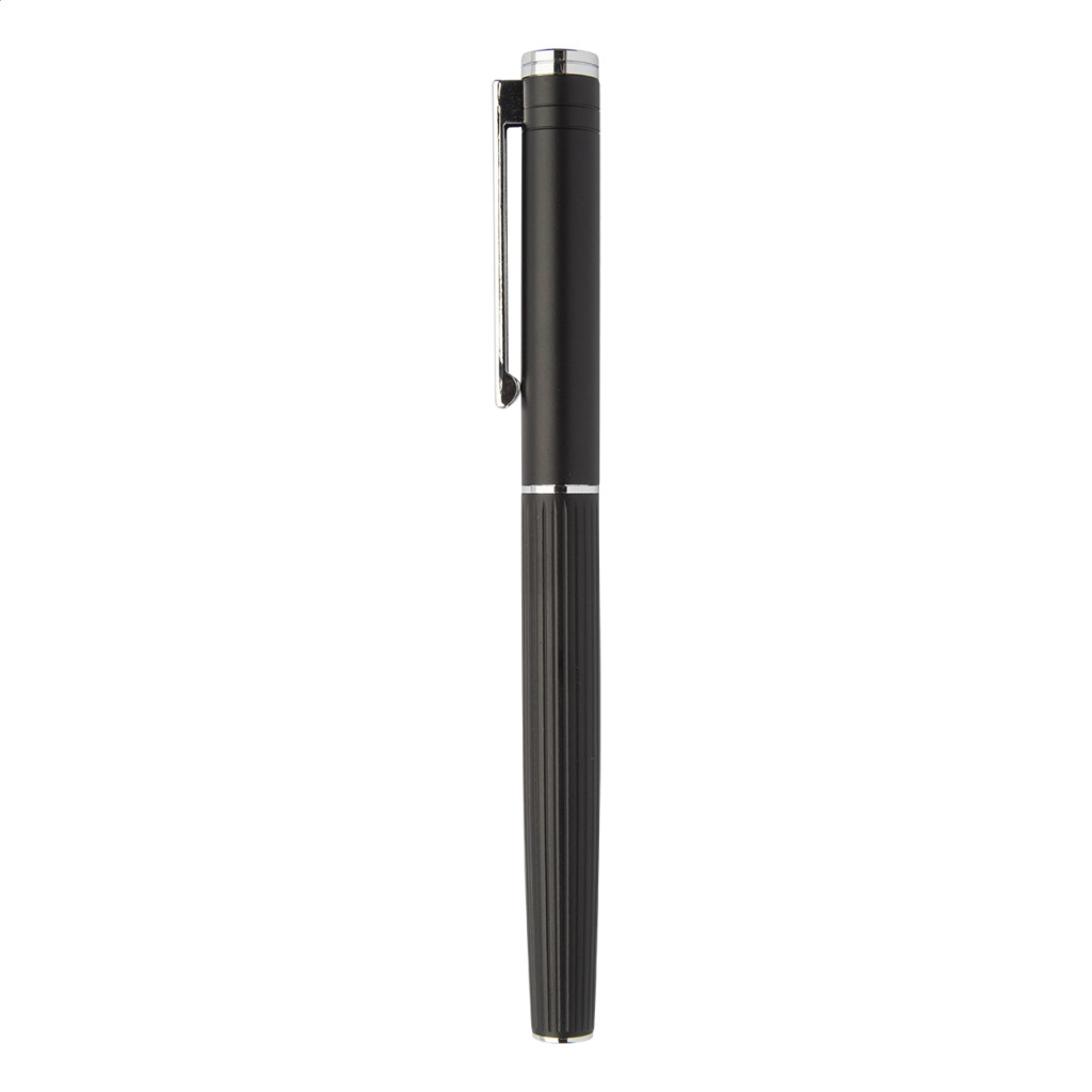 Elegáns, alumínium golyóstoll és rollertoll szett, csíkozott felülettel. Fekete díszdobozban, kék tollbetéttel szállítjuk.