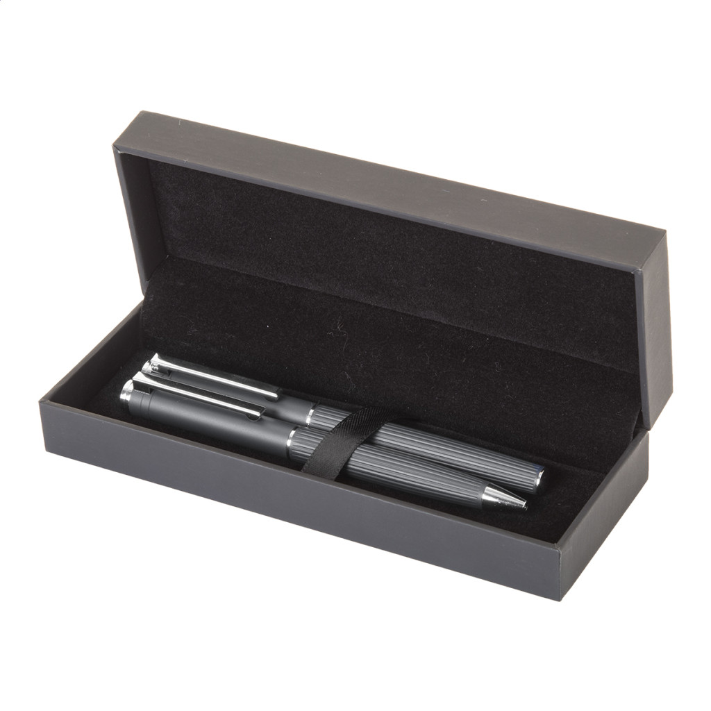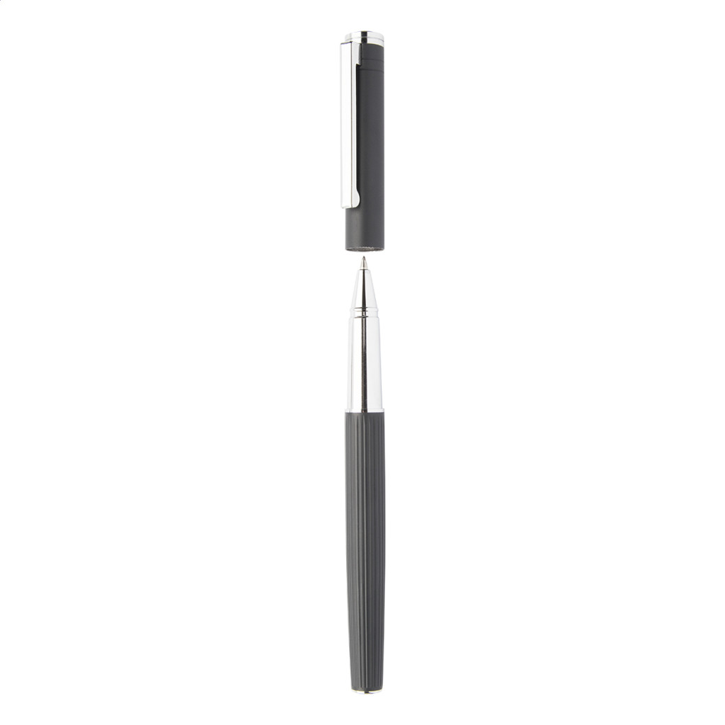 Elegáns, alumínium golyóstoll és rollertoll szett, csíkozott felülettel. Fekete díszdobozban, kék tollbetéttel szállítjuk.