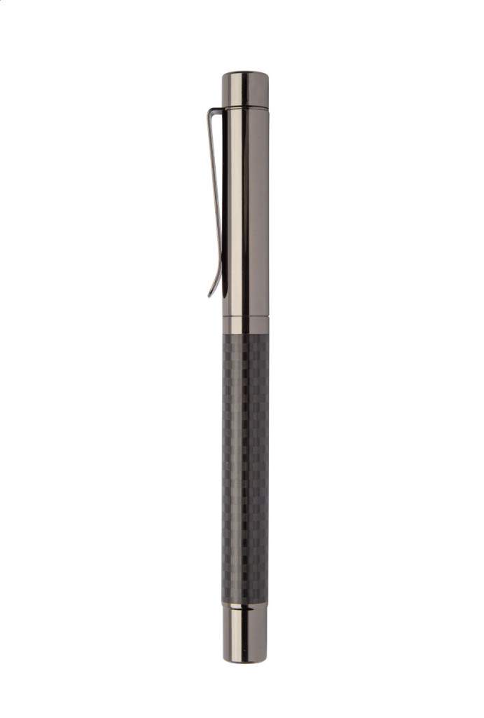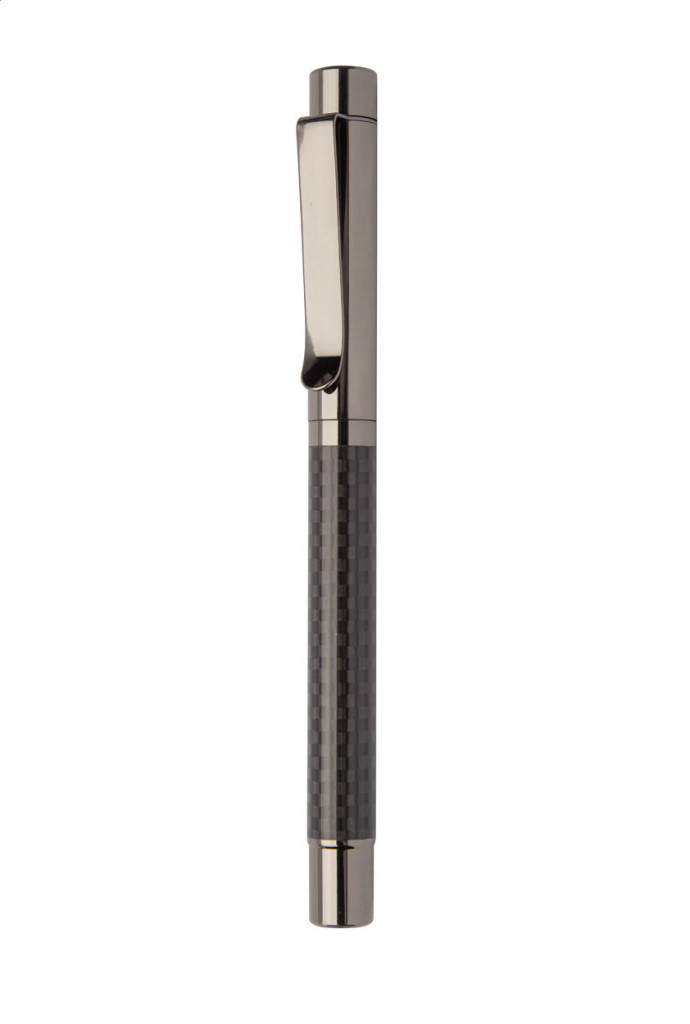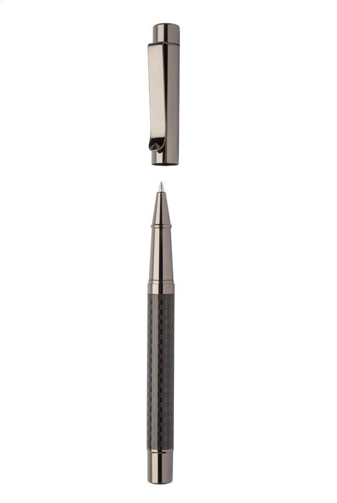 Elegáns, fém golyóstoll és rollertoll szett, szénmintás testtel és fémes felületű részekkel. Szénmintás díszdobozban, kék tollbetéttel szállítjuk.