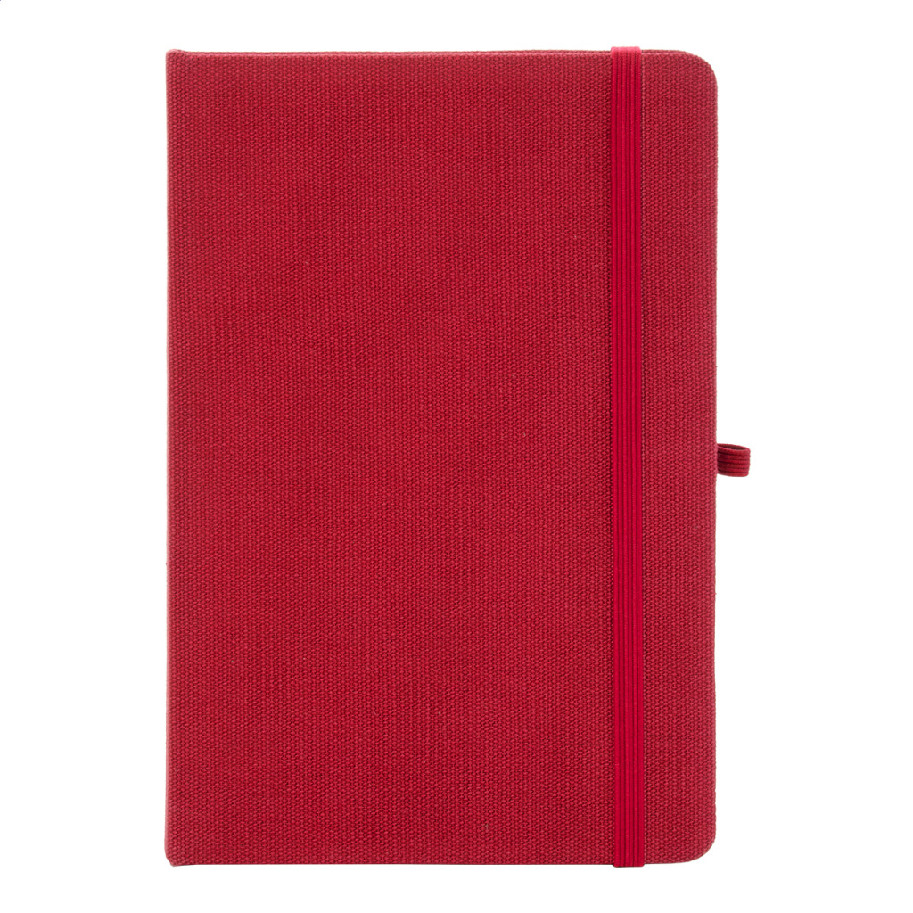 Újrahasznosított pamut borítású jegyzetfüzet 80 vonalas lappal, újrahasznosított papírból. Megegyező színű könyvjelzővel, gumiszalaggal és tolltartóval. A5 méretű.