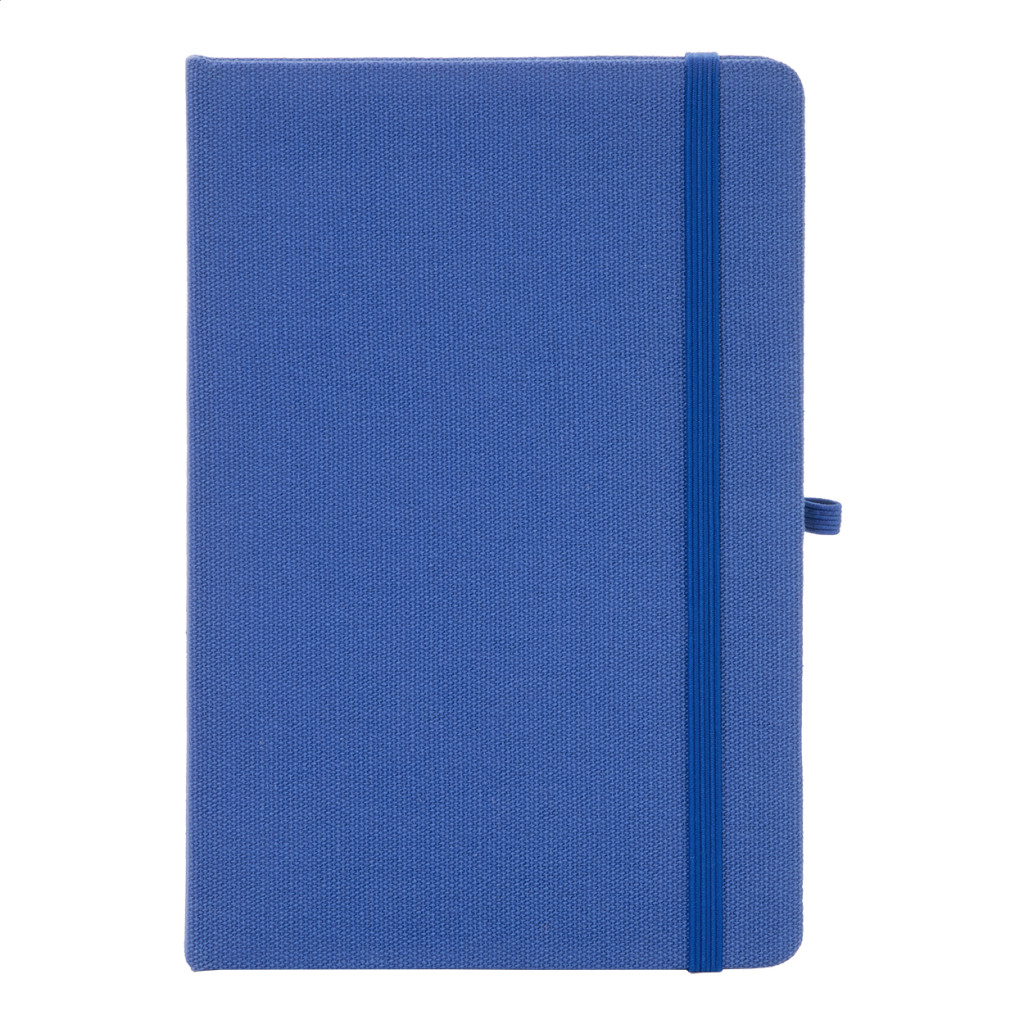 Újrahasznosított pamut borítású jegyzetfüzet 80 vonalas lappal, újrahasznosított papírból. Megegyező színű könyvjelzővel, gumiszalaggal és tolltartóval. A5 méretű.