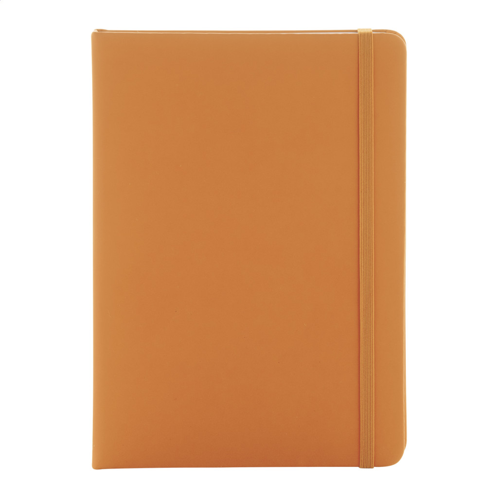Újrahasznosított PU bőr borítású jegyzetfüzet 100 vonalas lappal, újrahasznosított papírból. Megegyező színű könyvjelzővel és gumiszalaggal. A5 méretű.