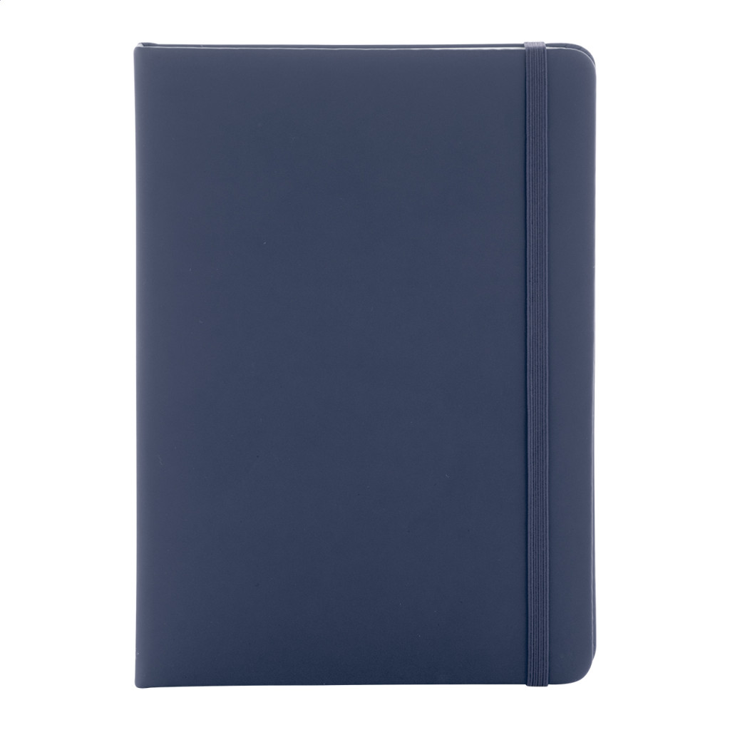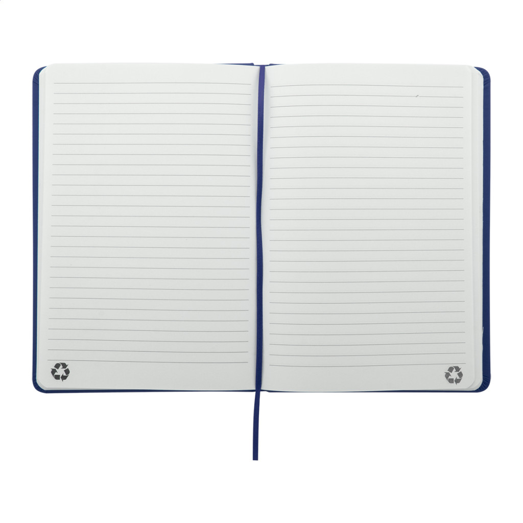 Újrahasznosított PU bőr borítású jegyzetfüzet 100 vonalas lappal, újrahasznosított papírból. Megegyező színű könyvjelzővel és gumiszalaggal. A5 méretű.