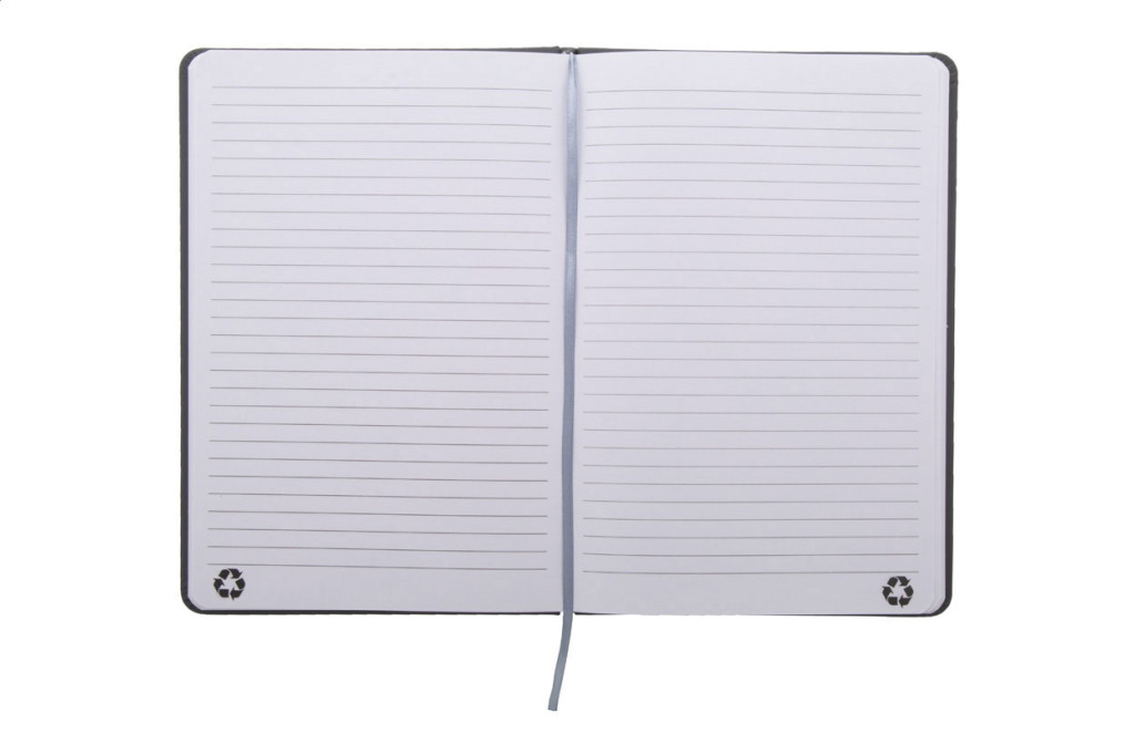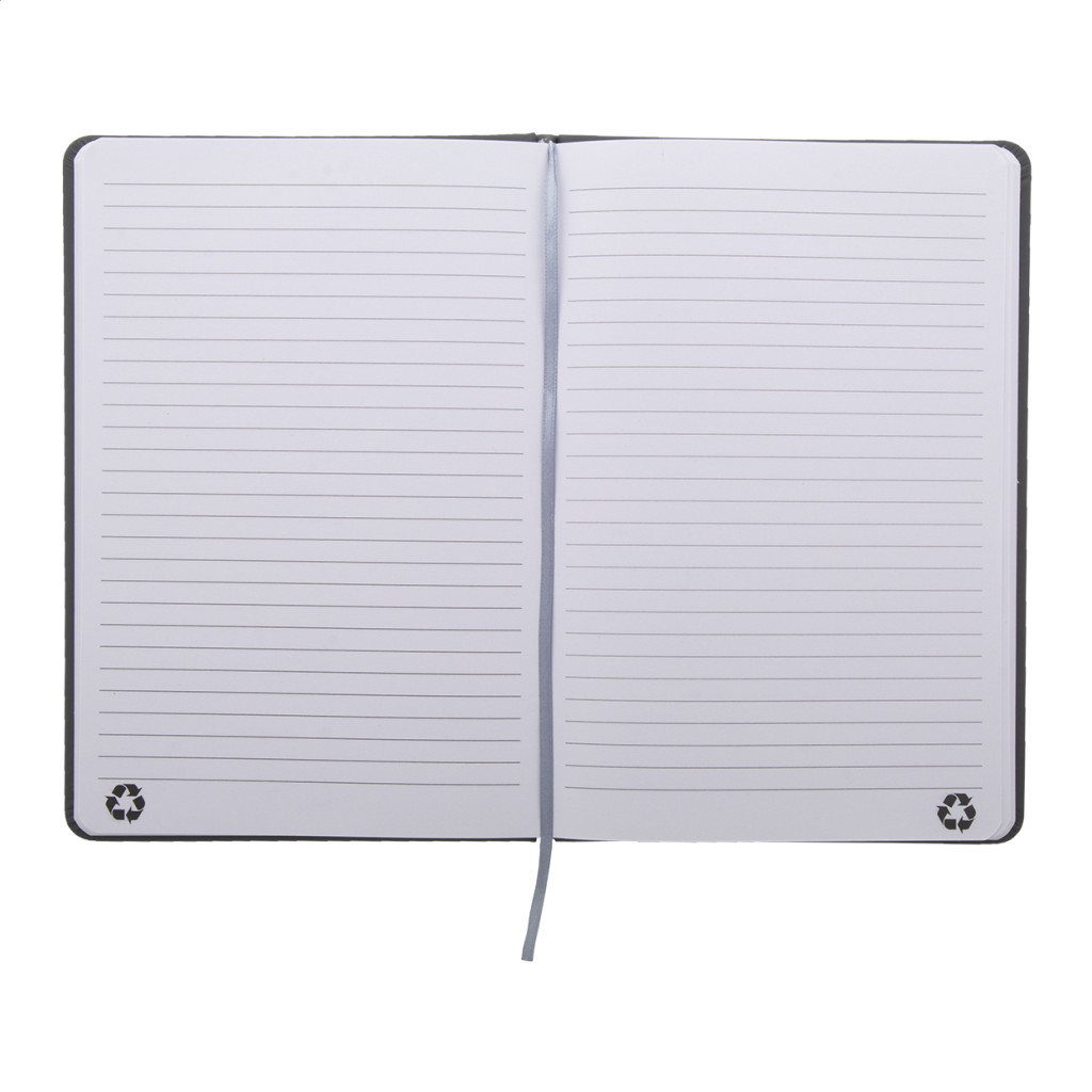 Újrahasznosított PU bőr borítású jegyzetfüzet 100 vonalas lappal, újrahasznosított papírból. Megegyező színű könyvjelzővel és gumiszalaggal. A5 méretű.
