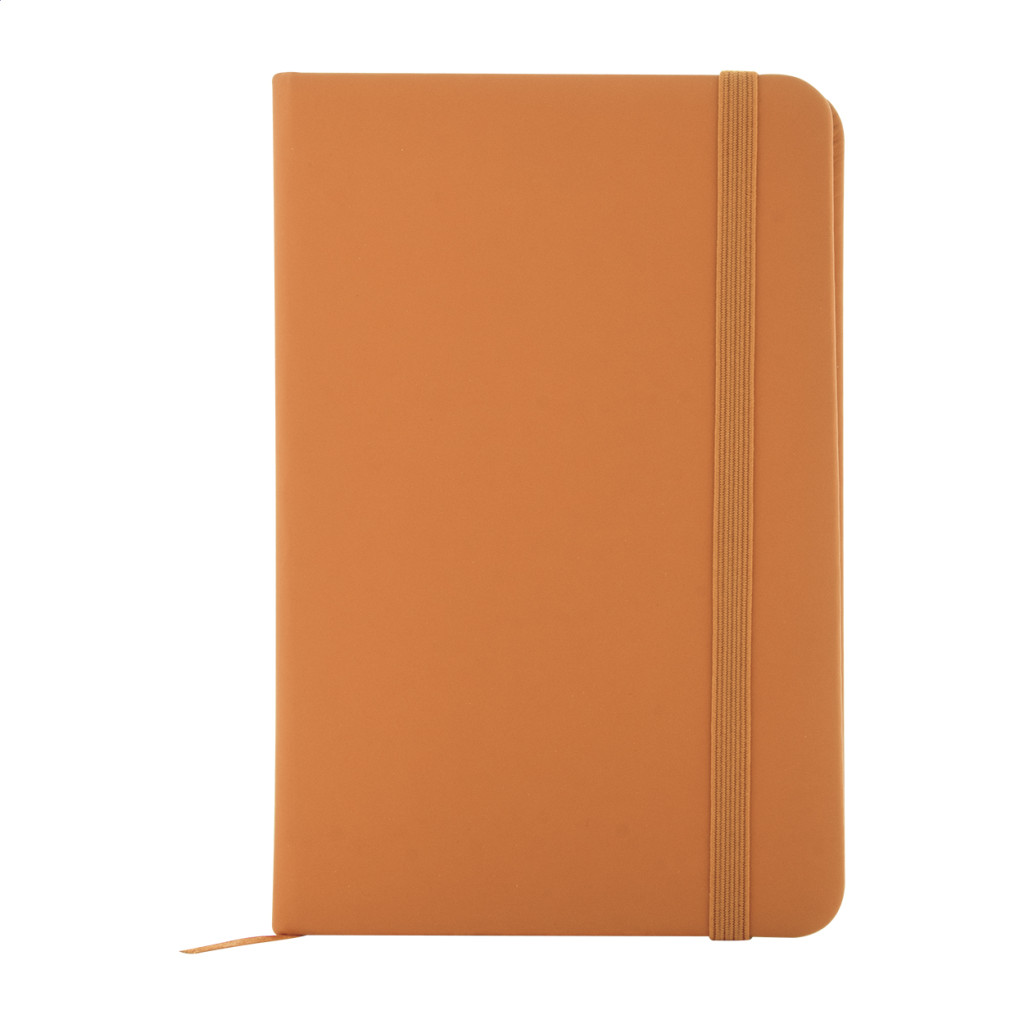 Újrahasznosított PU bőr borítású jegyzetfüzet 100 vonalas lappal, újrahasznosított papírból. Megegyező színű könyvjelzővel és gumiszalaggal. A6 méretű.