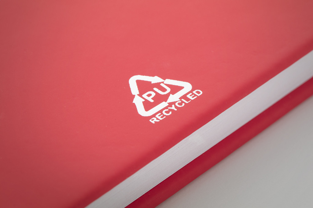 Újrahasznosított PU bőr borítású jegyzetfüzet 100 vonalas lappal, újrahasznosított papírból. Megegyező színű könyvjelzővel és gumiszalaggal. A6 méretű.
