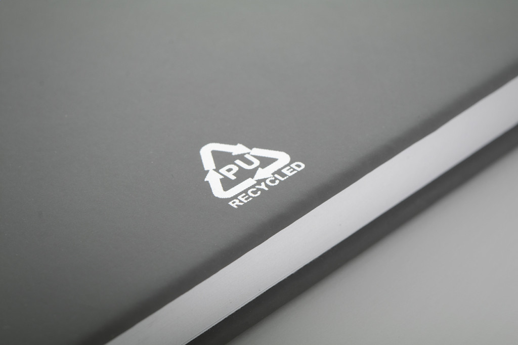Újrahasznosított PU bőr borítású jegyzetfüzet 100 vonalas lappal, újrahasznosított papírból. Megegyező színű könyvjelzővel és gumiszalaggal. A6 méretű.