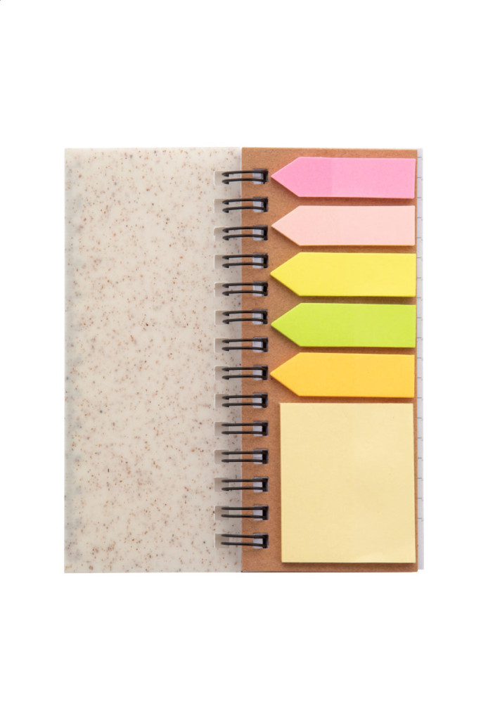 Ökológiai búzaszalma műanyag borítású spirálfüzet 40 vonalas lappal újrahasznosított papírból, 25 öntapadós jegyzetlappal és 125 oldaljelölővel (5 különböző színben). 12 cm-es vonalzóval a borítón.