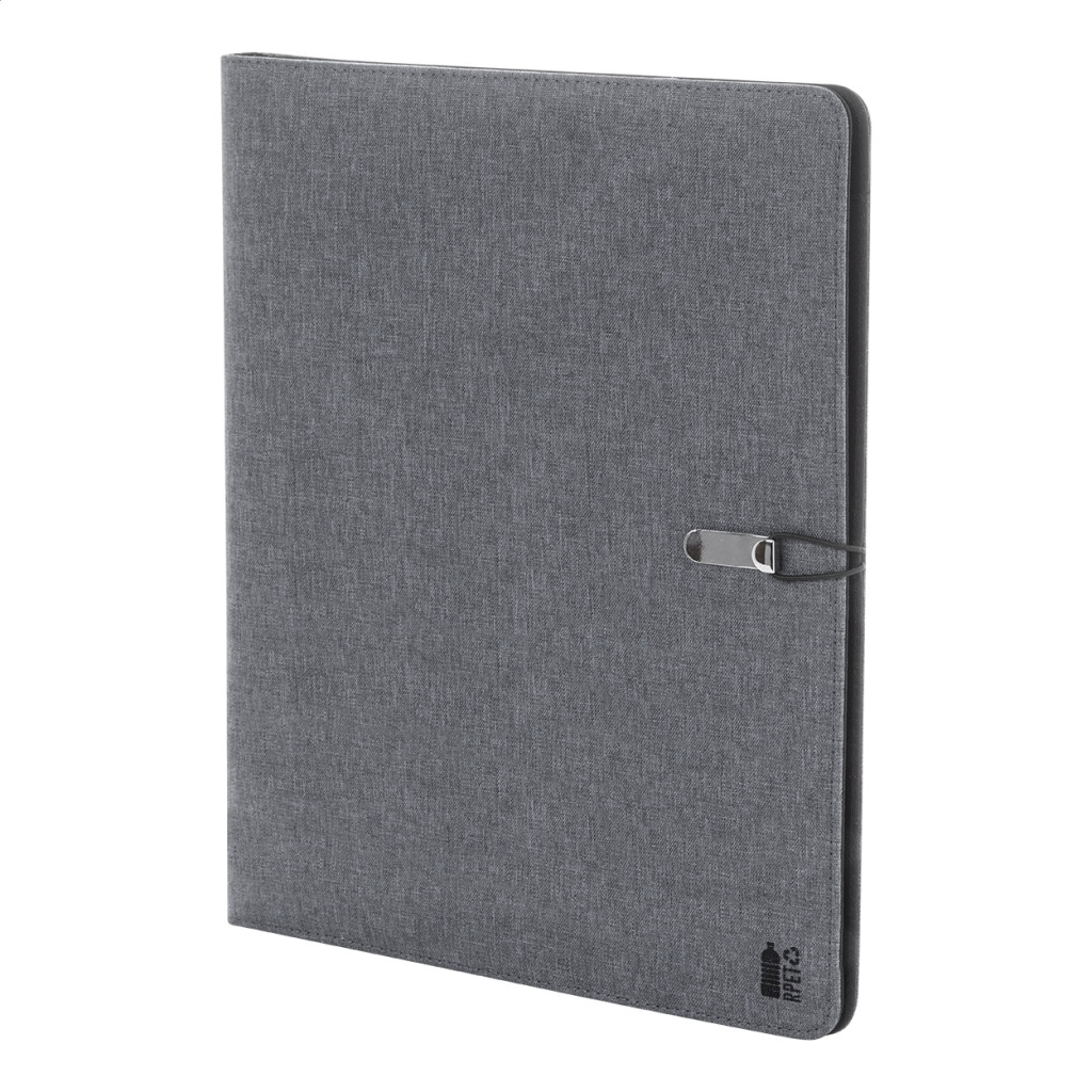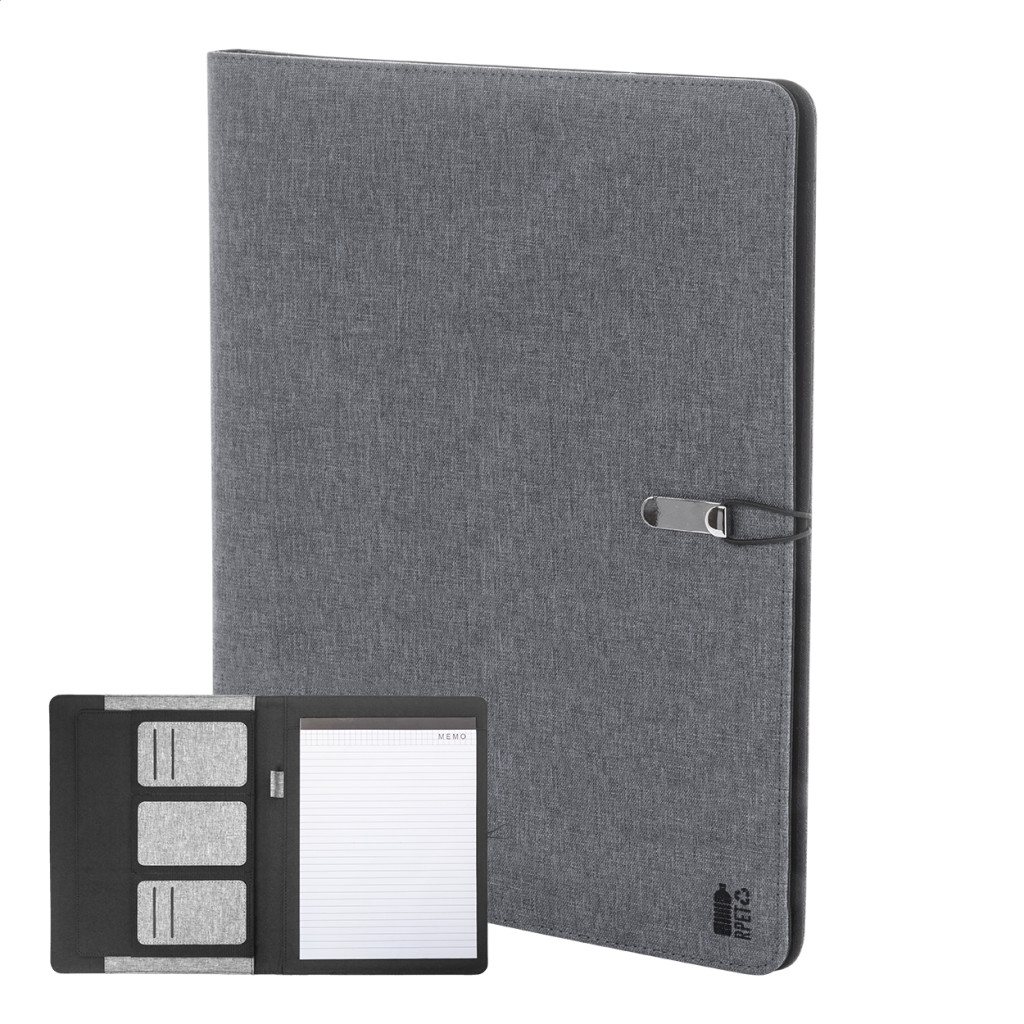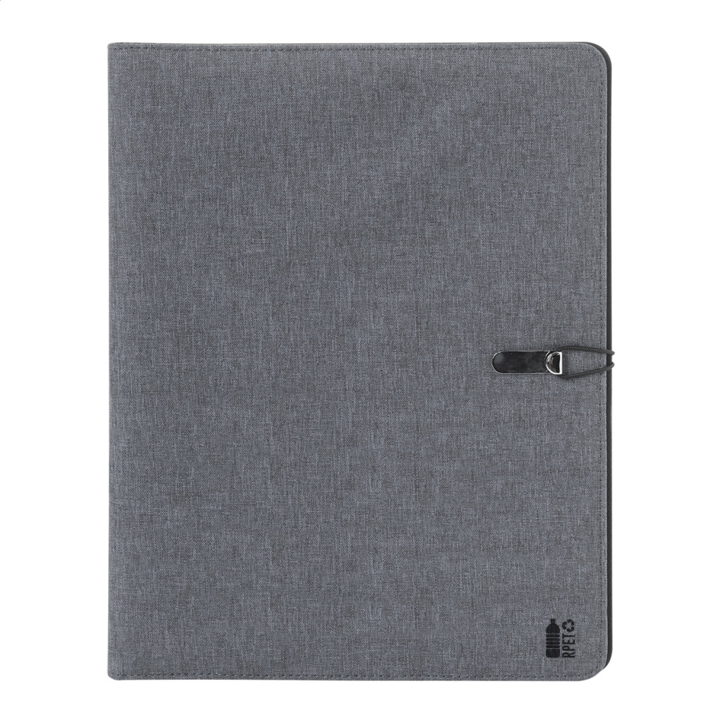 A4 méretű, 300D RPET poliészter iratmappa 25 vonalas lappal és belső rekeszekkel.