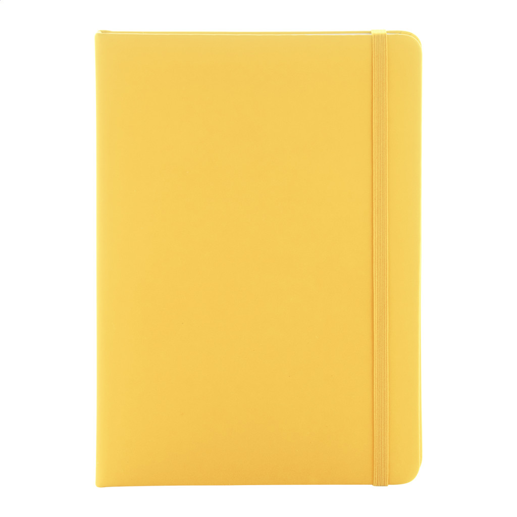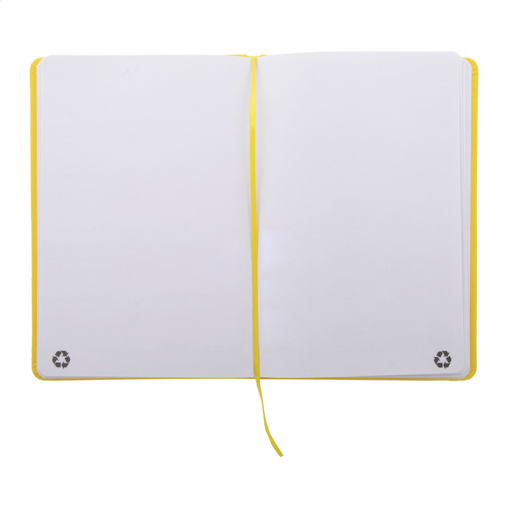 Úrahasznosított PU bőr borítású jegyzetfüzet újrahasznosított papírból készült 100 sima lappal. Hozzáillő színű gumipánttal és könyvjelzővel. A5 méretű.
