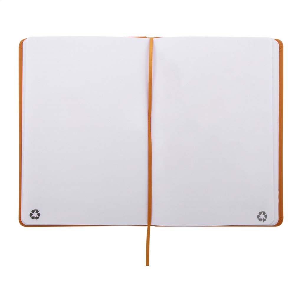Úrahasznosított PU bőr borítású jegyzetfüzet újrahasznosított papírból készült 100 sima lappal. Hozzáillő színű gumipánttal és könyvjelzővel. A5 méretű.