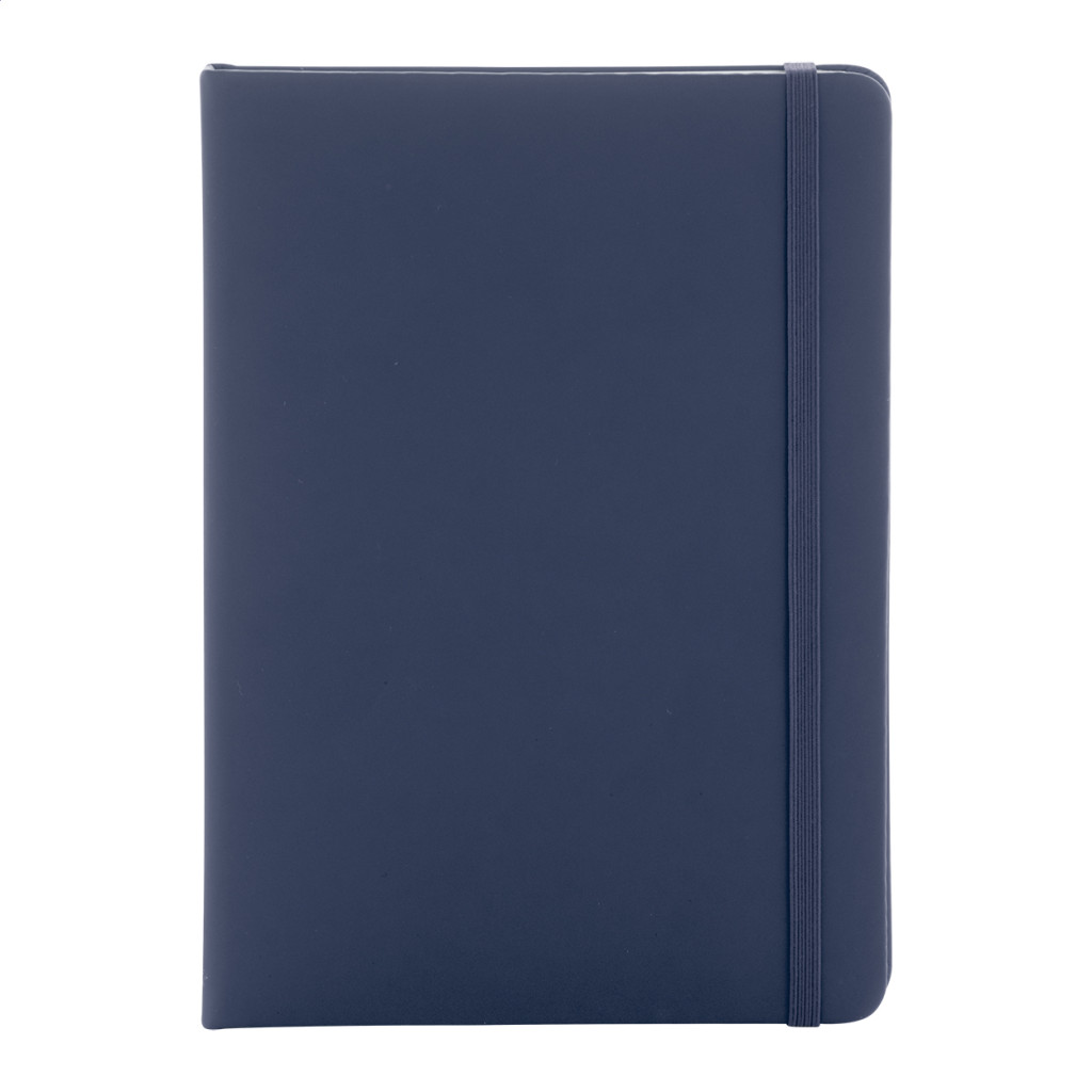 Úrahasznosított PU bőr borítású jegyzetfüzet újrahasznosított papírból készült 100 sima lappal. Hozzáillő színű gumipánttal és könyvjelzővel. A5 méretű.