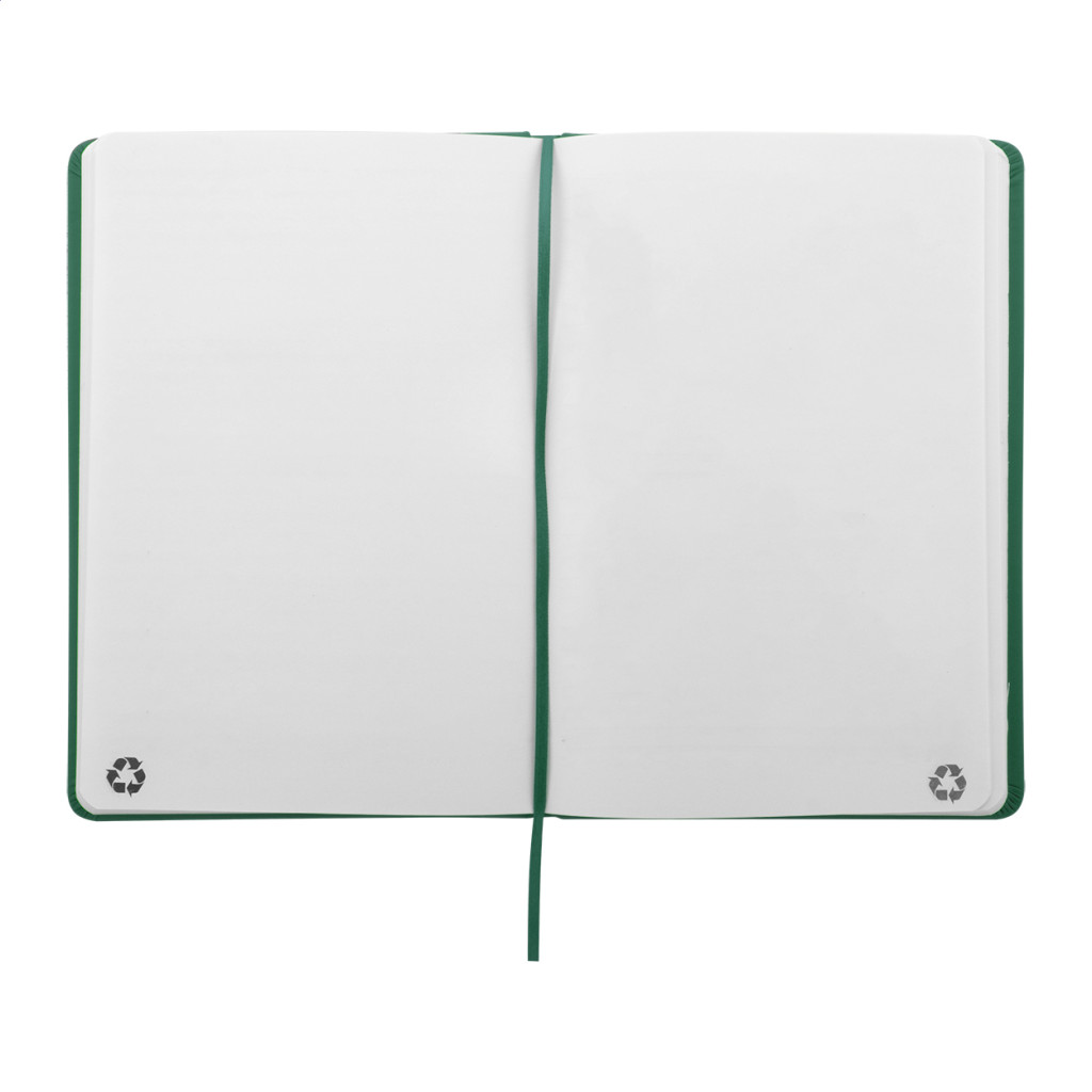 Úrahasznosított PU bőr borítású jegyzetfüzet újrahasznosított papírból készült 100 sima lappal. Hozzáillő színű gumipánttal és könyvjelzővel. A5 méretű.