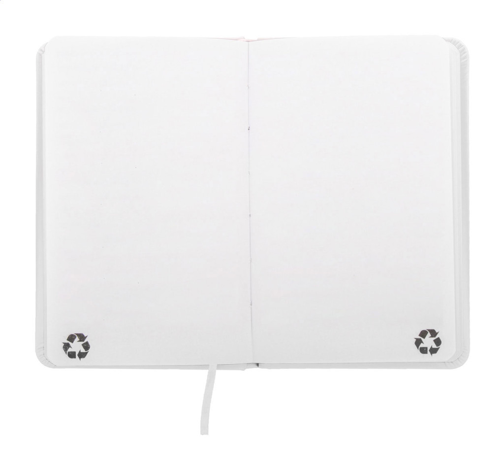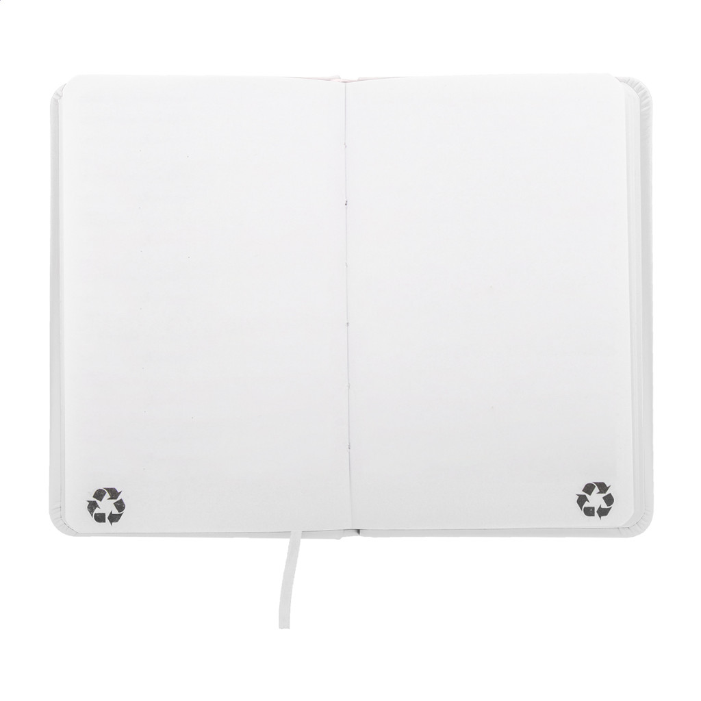 Úrahasznosított PU bőr borítású jegyzetfüzet újrahasznosított papírból készült 100 sima lappal. Hozzáillő színű gumipánttal és könyvjelzővel. A6 méretű.