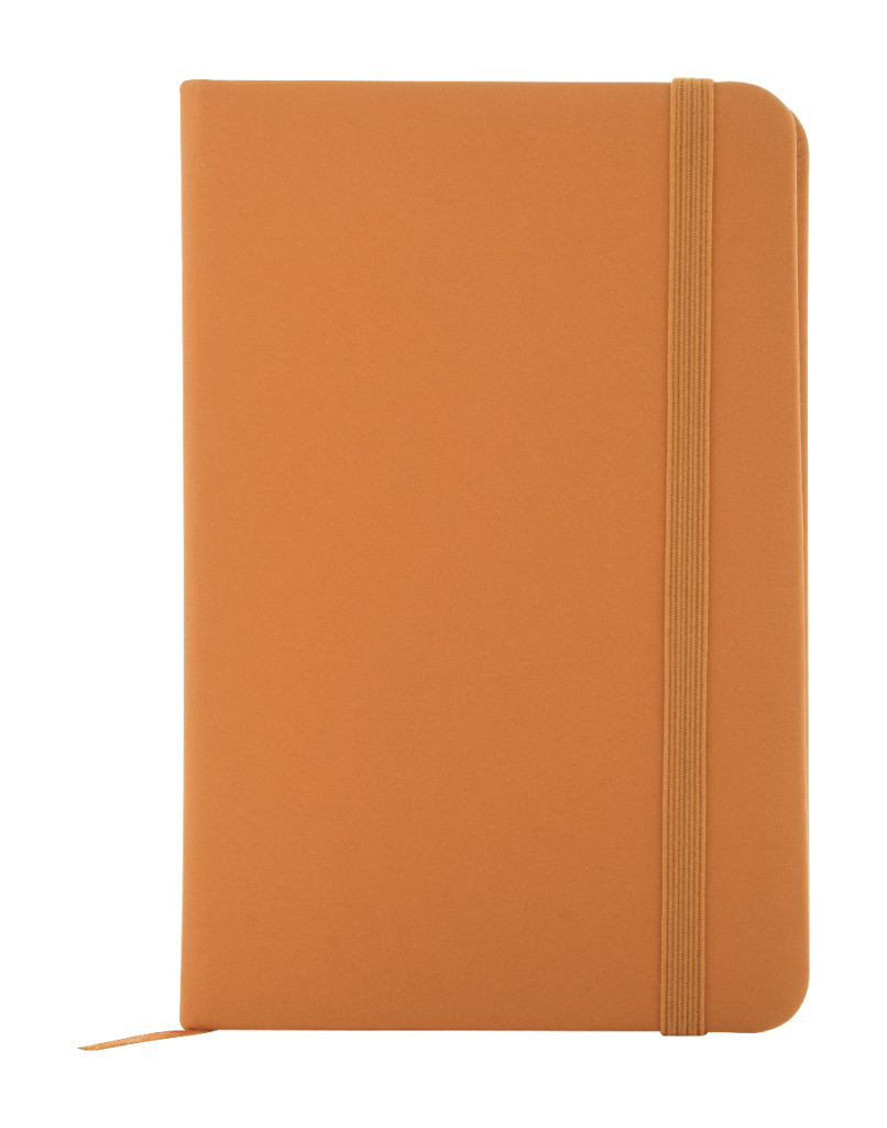 Úrahasznosított PU bőr borítású jegyzetfüzet újrahasznosított papírból készült 100 sima lappal. Hozzáillő színű gumipánttal és könyvjelzővel. A6 méretű.