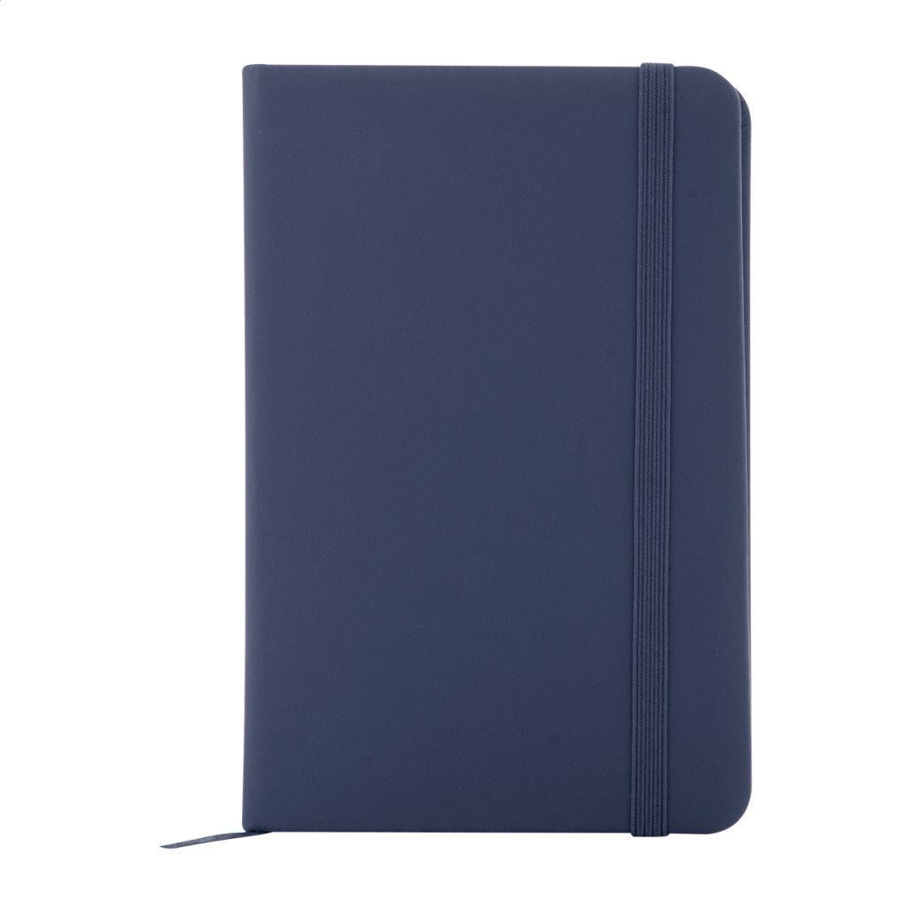Úrahasznosított PU bőr borítású jegyzetfüzet újrahasznosított papírból készült 100 sima lappal. Hozzáillő színű gumipánttal és könyvjelzővel. A6 méretű.