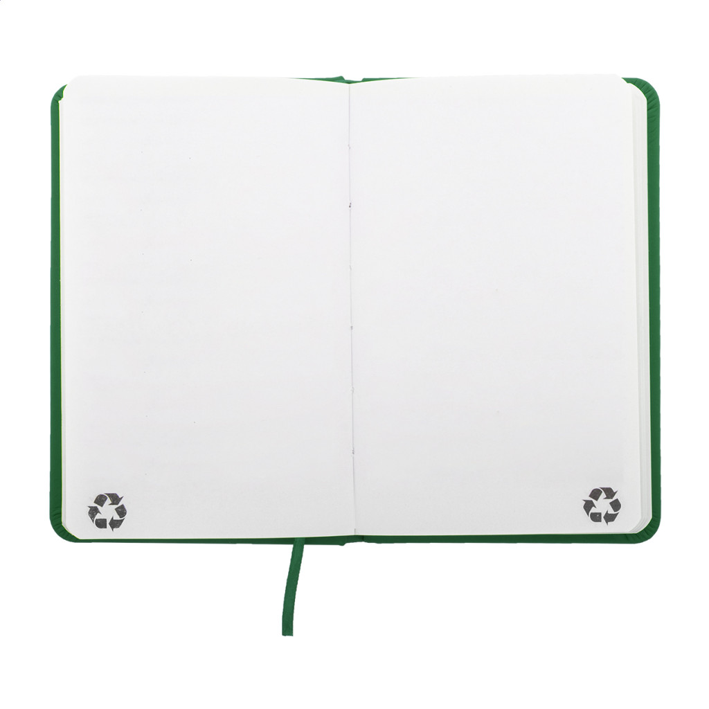 Úrahasznosított PU bőr borítású jegyzetfüzet újrahasznosított papírból készült 100 sima lappal. Hozzáillő színű gumipánttal és könyvjelzővel. A6 méretű.