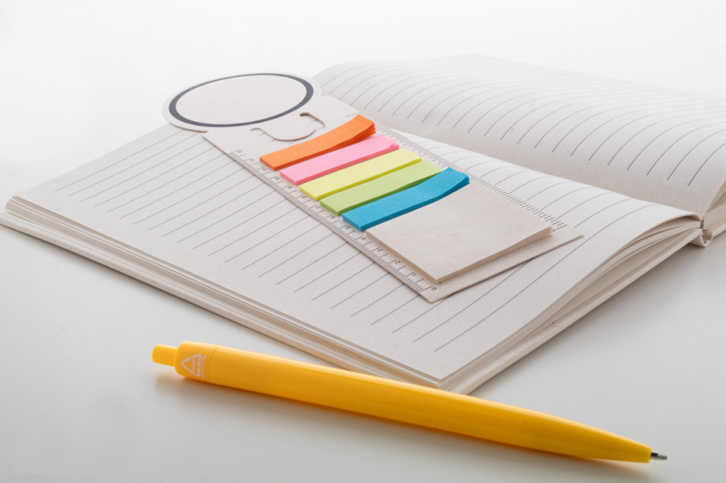 Újrahasznosított tejesdoboz könyvjelző és vonalzó 15 öntapadós jegyzetlappal és 75 oldaljelölővel (5 különböző színben).