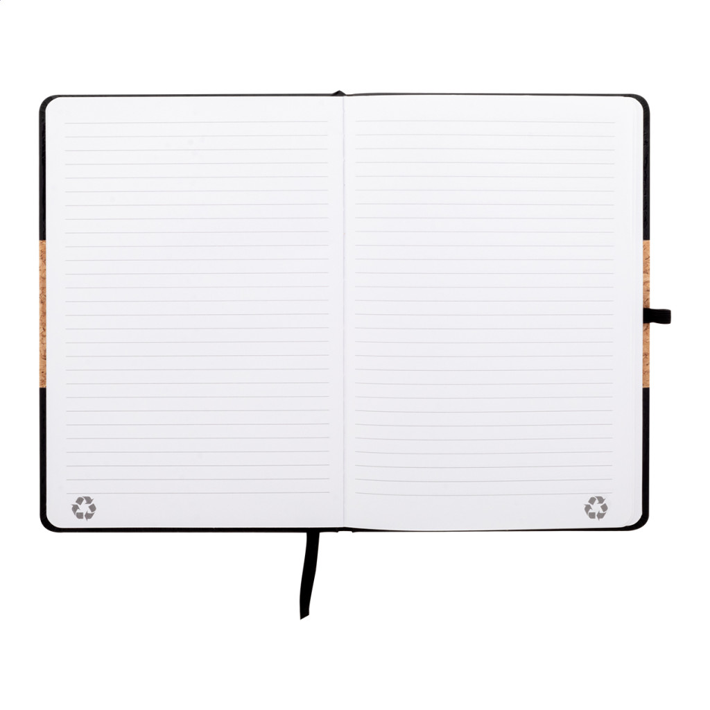 Természetes parafa és újrahasznosított PU bőr borítású jegyzetfüzet hozzáillő színű könyvjelzővel, gumiszalaggal és tolltartóval. 80 vonalas lappal, újrahasznosított papírból. A5 méretű.