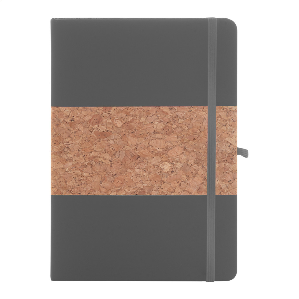 Természetes parafa és újrahasznosított PU bőr borítású jegyzetfüzet hozzáillő színű könyvjelzővel, gumiszalaggal és tolltartóval. 80 vonalas lappal, újrahasznosított papírból. A5 méretű.