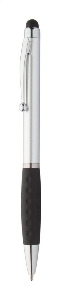 Műanyag, érintőképernyős toll gumimarkolattal és fém hatású kiegészítőkkel. Kék tollbetéttel szállítjuk.