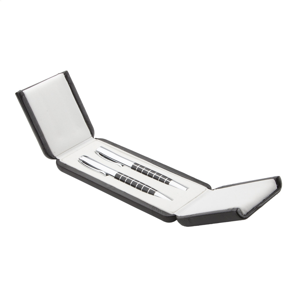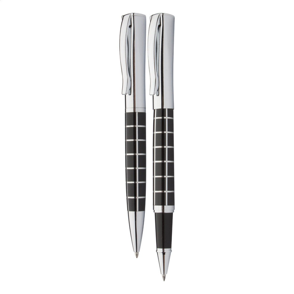 Elegáns fém golyóstoll és rollertoll szett, fénylő króm részekkel és mintás testtel. PU bőr díszdobozban, kék tollbetéttel szállítjuk. André Philippe márkatermék.