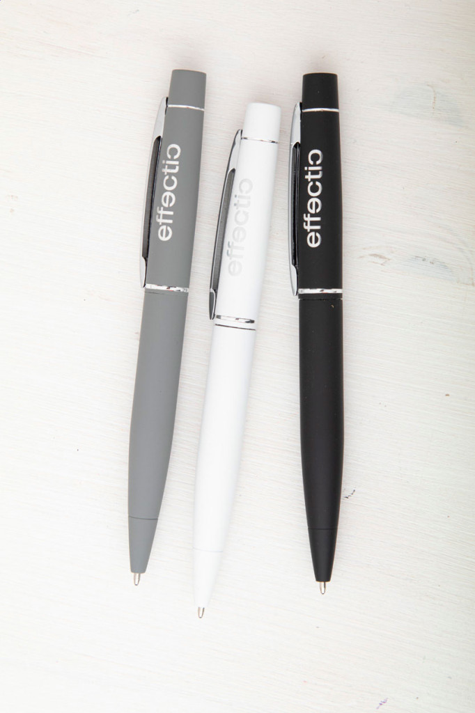 Fém, tekerős golyóstoll gumírozott felülettel. Kék tollbetéttel szállítjuk. Speciális bevonattal rendelkezik, amely különlegesen fényessé teszi a gravírozott emblémát.