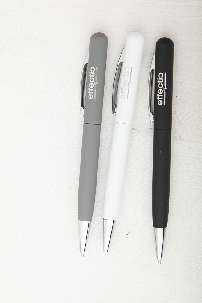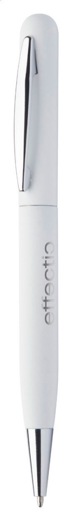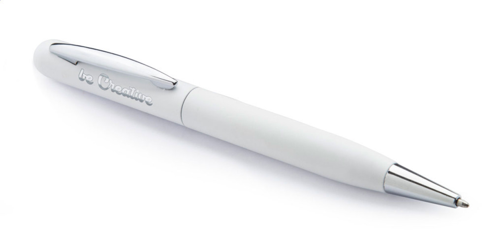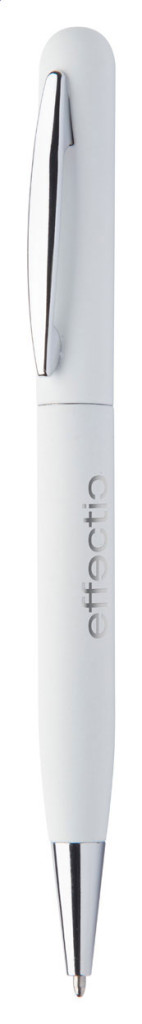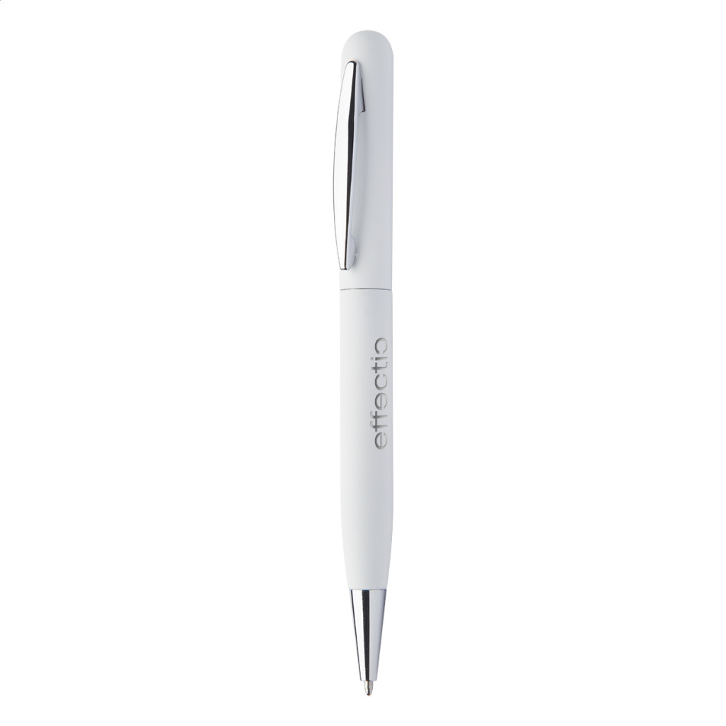 Fém, tekerős golyóstoll gumírozott felülettel. Kék tollbetéttel szállítjuk. Speciális bevonattal rendelkezik, amely különlegesen fényessé teszi a gravírozott emblémát.