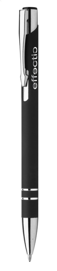 Alumínium golyóstoll gumírozott felülettel. Kék tollbetéttel szállítjuk. Speciális bevonattal rendelkezik, amely különlegesen fényessé teszi a gravírozott emblémát.