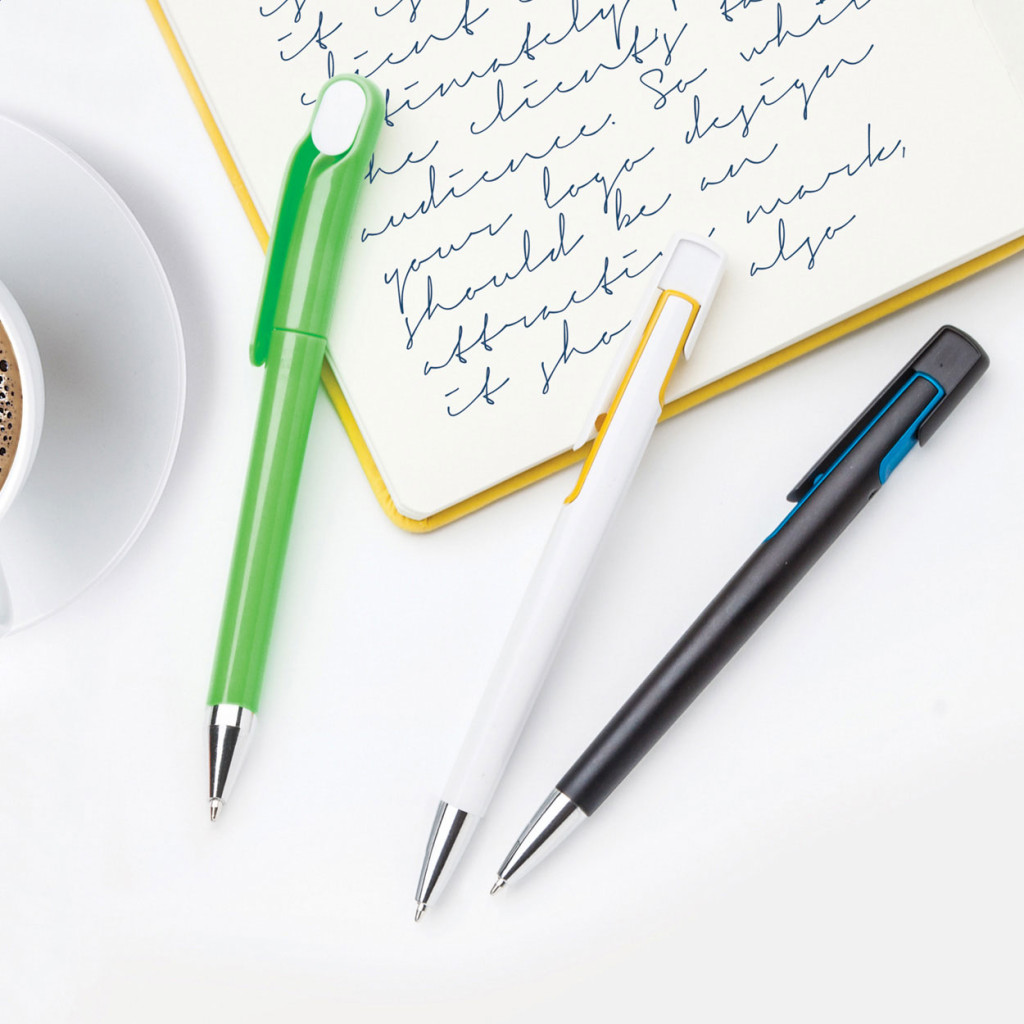 Műanyag golyóstoll színes dekorációval és króm véggel. Kék tollbetéttel szállítjuk.