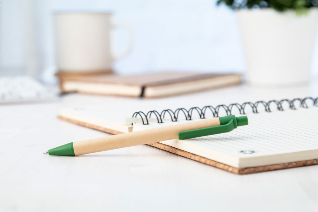 Újrahasznosított papírból készült golyóstoll biológiailag lebontható PLA műanyag részekkel. Kék töltőtollal szállítjuk.
