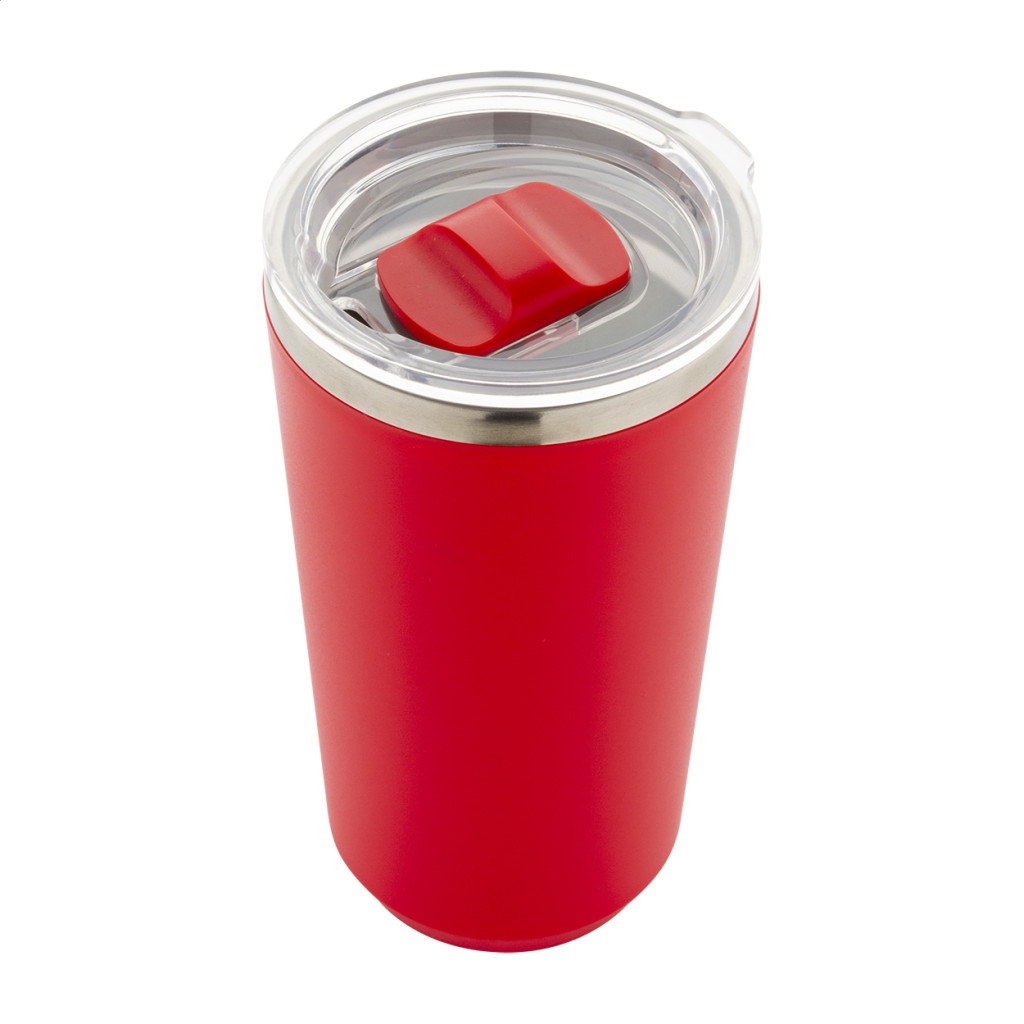 PP műanyag borítású, duplafalú, rozsdamentes acél termo pohár ivófedéllel. 500 ml.