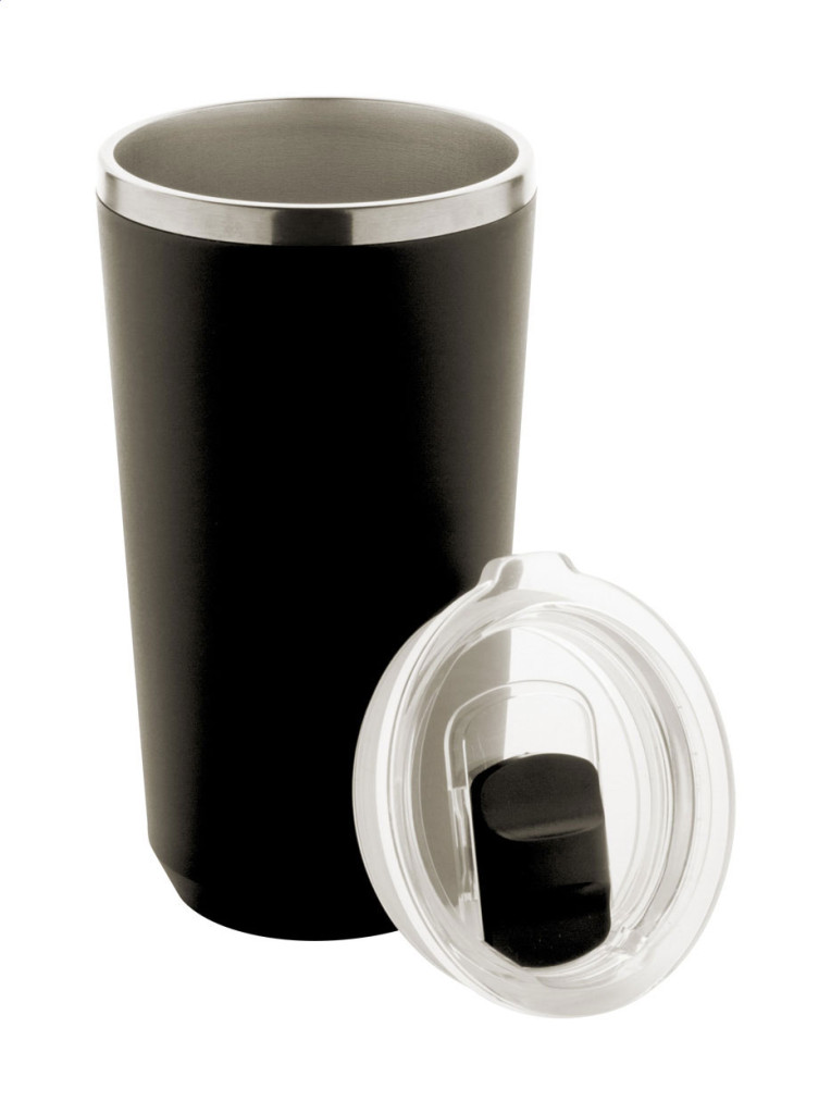 PP műanyag borítású, duplafalú, rozsdamentes acél termo pohár ivófedéllel. 500 ml.