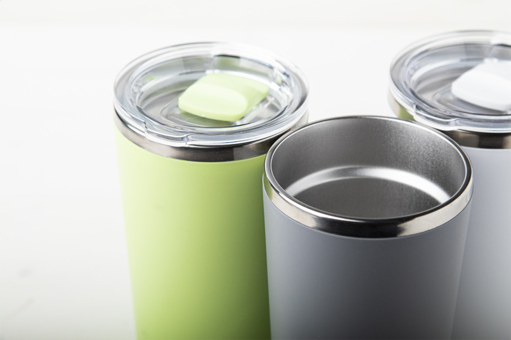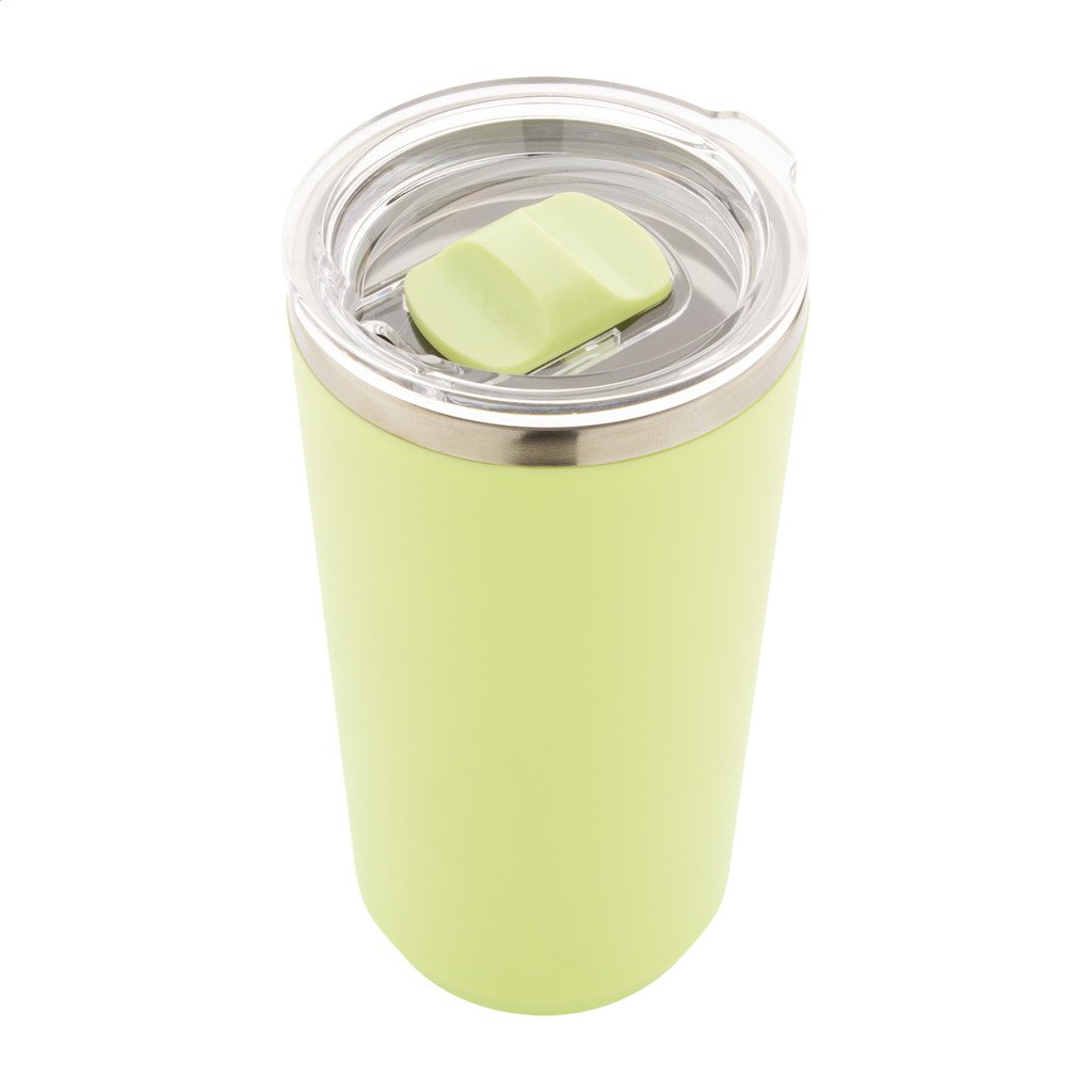 PP műanyag borítású, duplafalú, rozsdamentes acél termo pohár ivófedéllel. 500 ml.