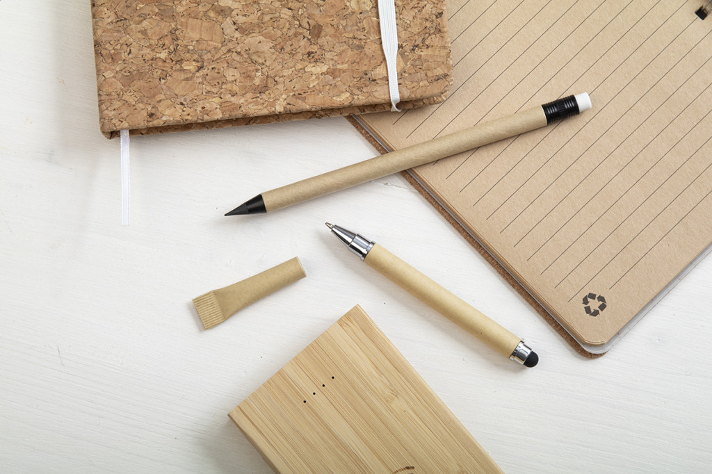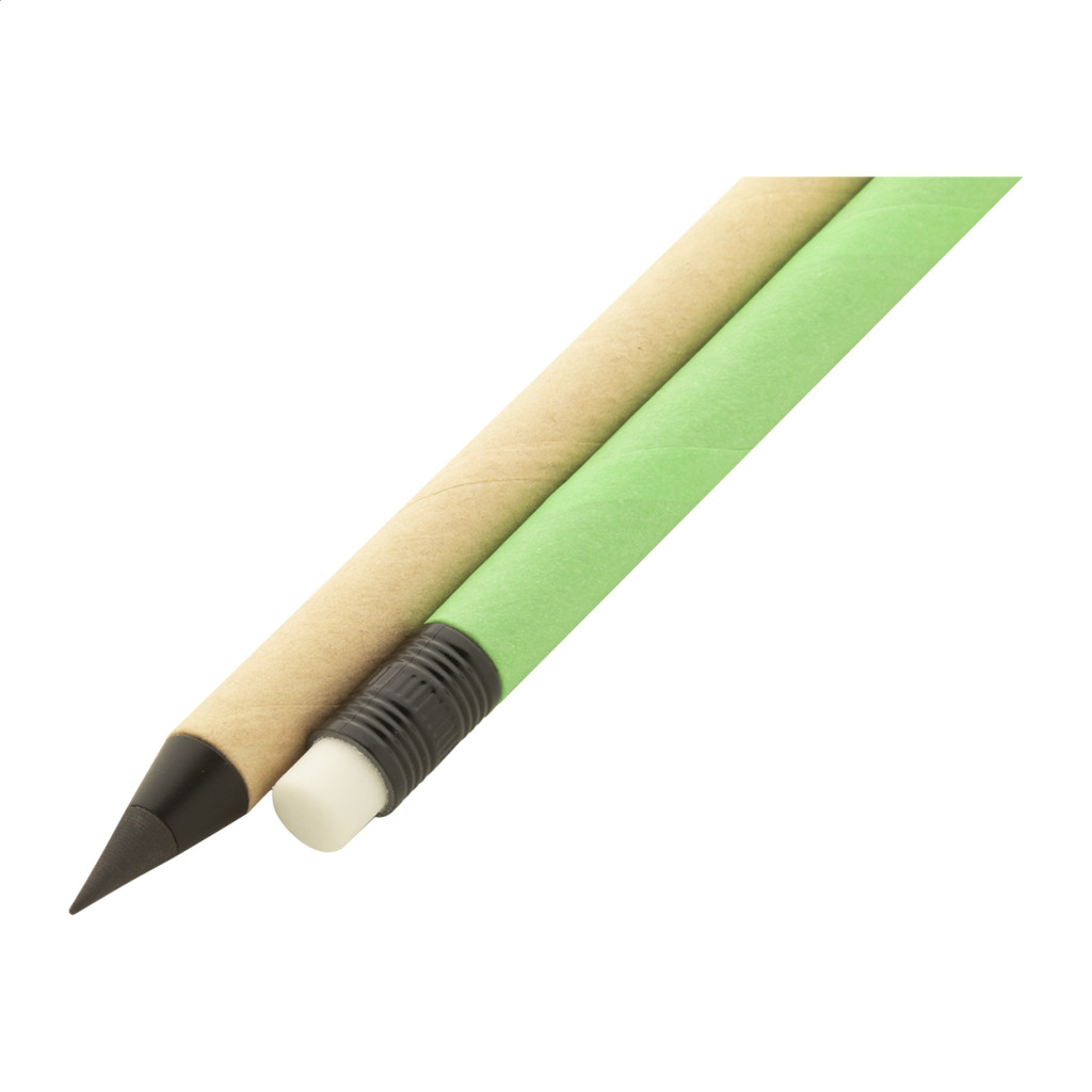 Hosszú élettartamú, újrahasznosított papírból készült tintamentes toll fekete részletekkel és radírral. Fémötvözet heggyel, amely oxidálja a papírt. Ez a toll a ceruzához hasonlóan ír, és radírozható is.