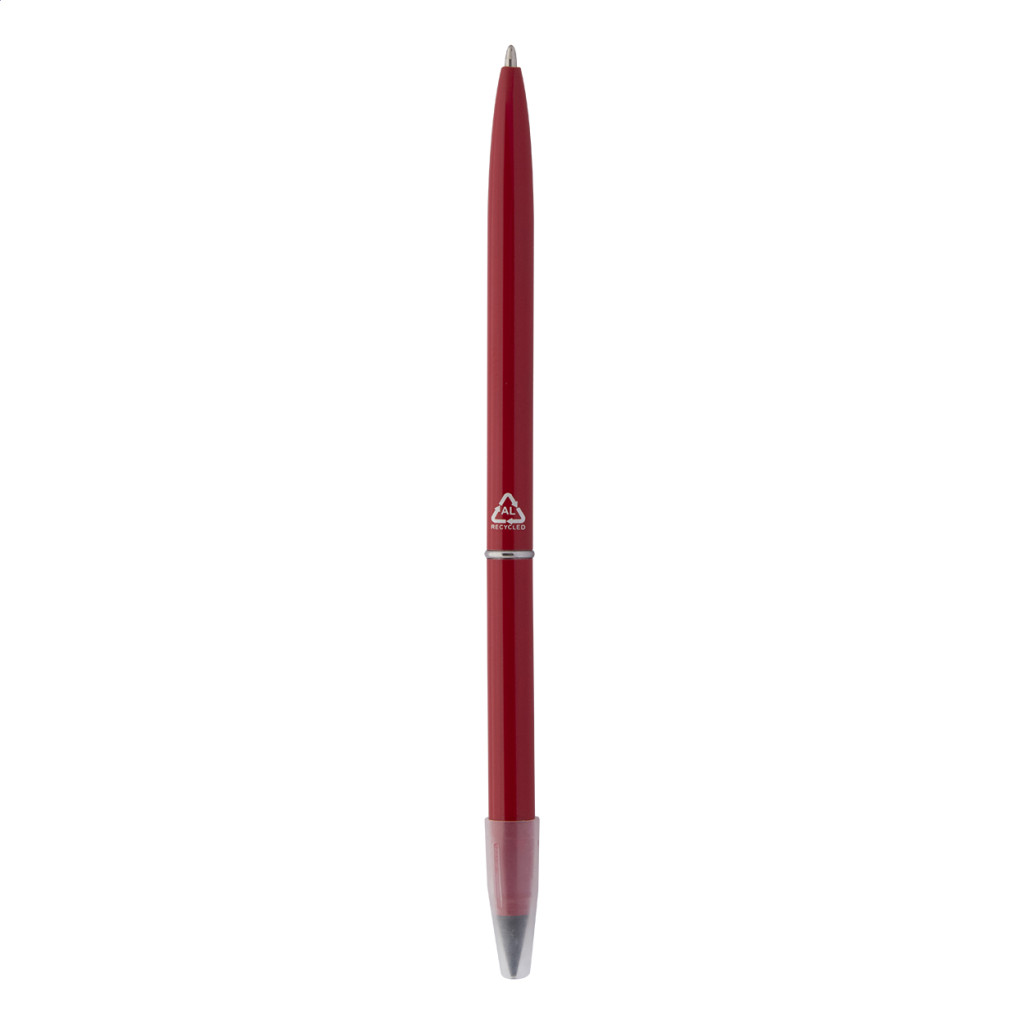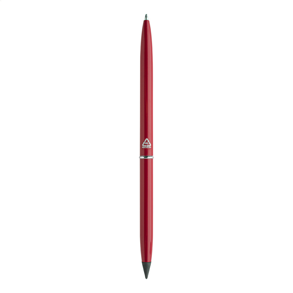 Többfunkciós, újrahasznosított alumínium golyóstoll és tintamentes toll. Kék tollbetéttel és fémötvözet heggyel, amely oxidálja a papírt. A tintamentes toll a ceruzához hasonlóan ír, és radírozható is.