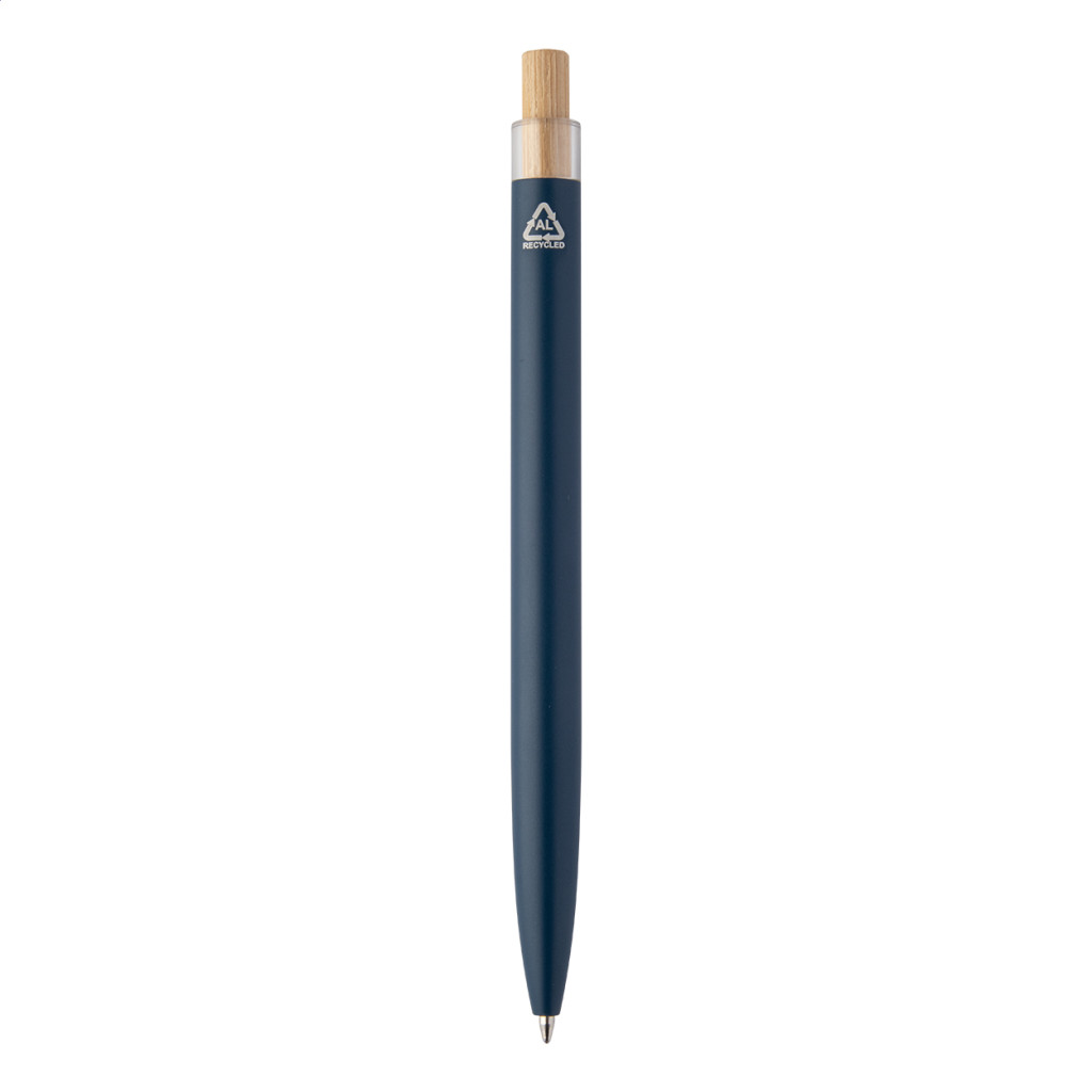 Újrahasznosított alumínium golyóstoll bambusz gombbal. Kék tollbetéttel szállítjuk.
