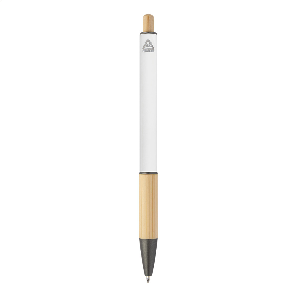 Újrahasznosított alumínium golyóstoll bambusz markolattal és gombbal, gumírozott testtel és fémes részekkel. Kék tollbetéttel szállítjuk.
