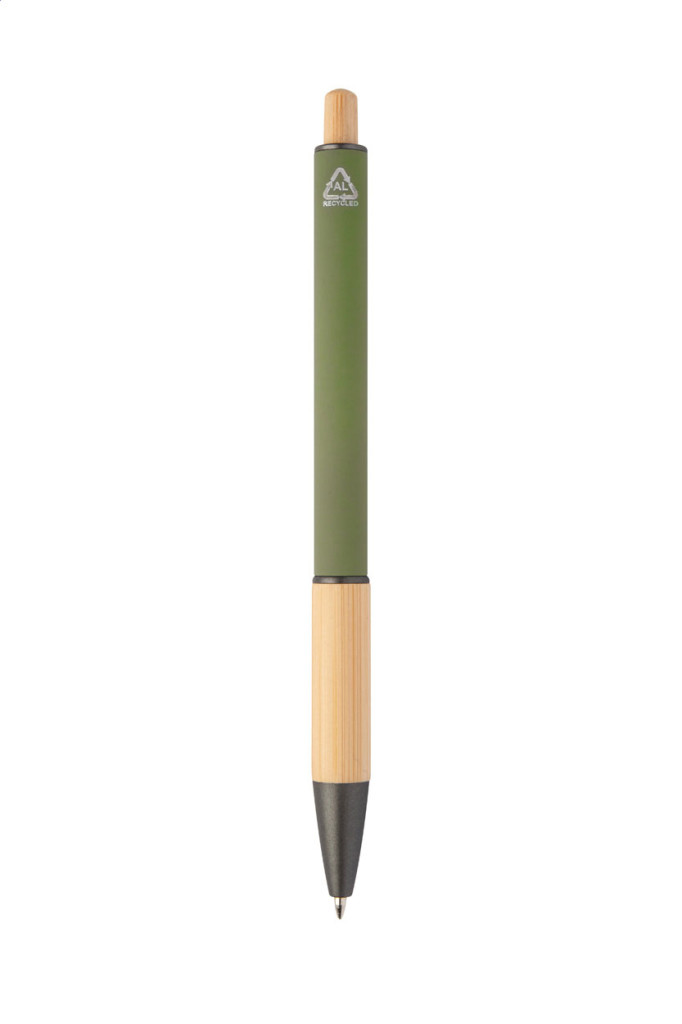 Újrahasznosított alumínium golyóstoll bambusz markolattal és gombbal, gumírozott testtel és fémes részekkel. Kék tollbetéttel szállítjuk.