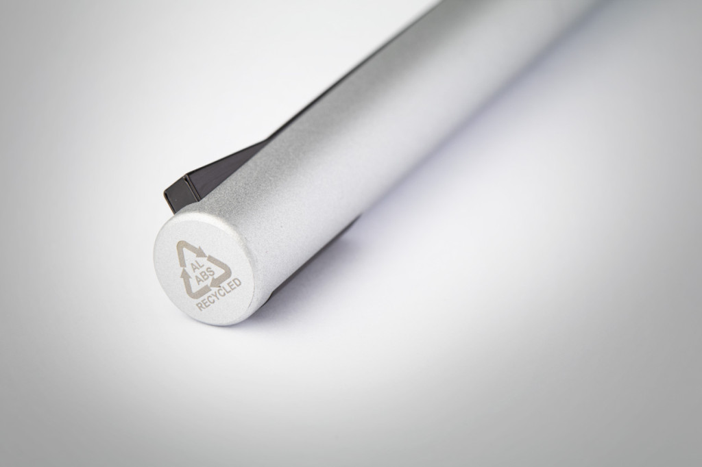 Újrahasznosított alumínium golyóstoll matt fémes színben, újrahasznosított ABS műanyag testtel és speciális klipsszel. Kék tollbetéttel szállítjuk.