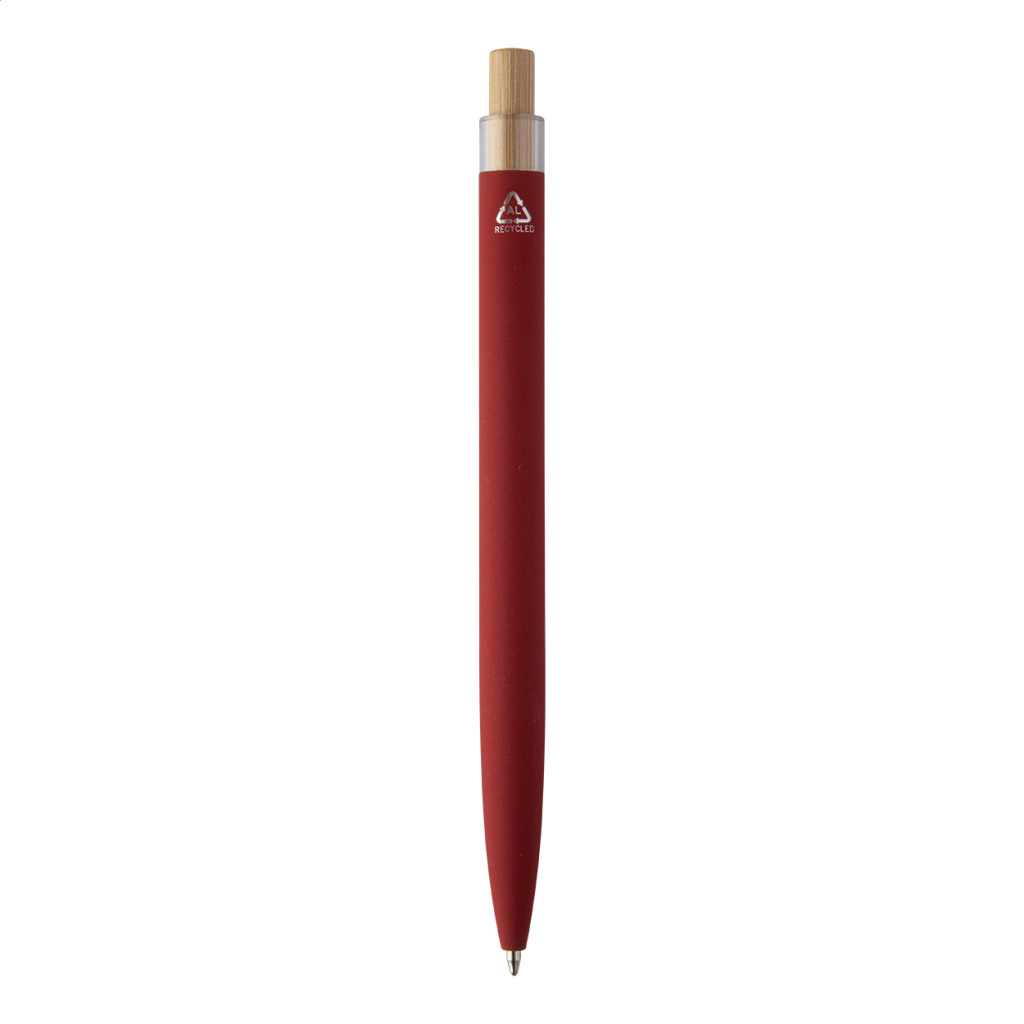 Újrahasznosított alumínium golyóstoll gumírozott felülettel, bambusz gombbal és króm klipsszel. Speciális bevonattal rendelkezik, amely különlegesen fényessé teszi a gravírozott emblémát. Kék tollbetéttel szállítjuk.