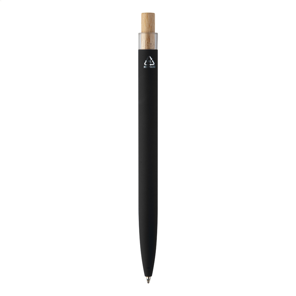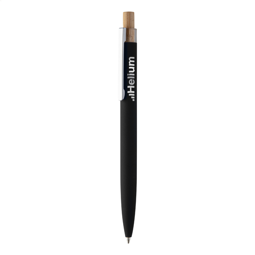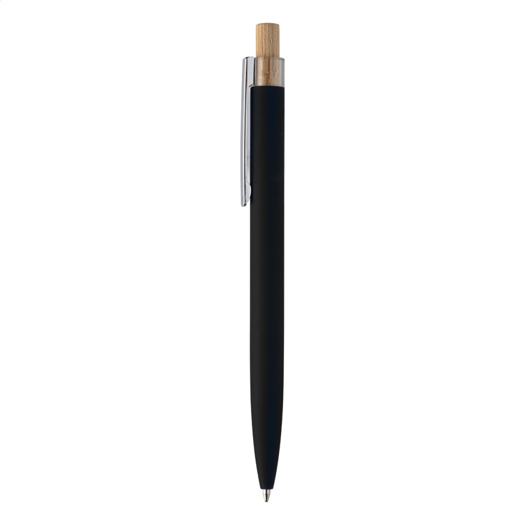 Újrahasznosított alumínium golyóstoll gumírozott felülettel, bambusz gombbal és króm klipsszel. Speciális bevonattal rendelkezik, amely különlegesen fényessé teszi a gravírozott emblémát. Kék tollbetéttel szállítjuk.
